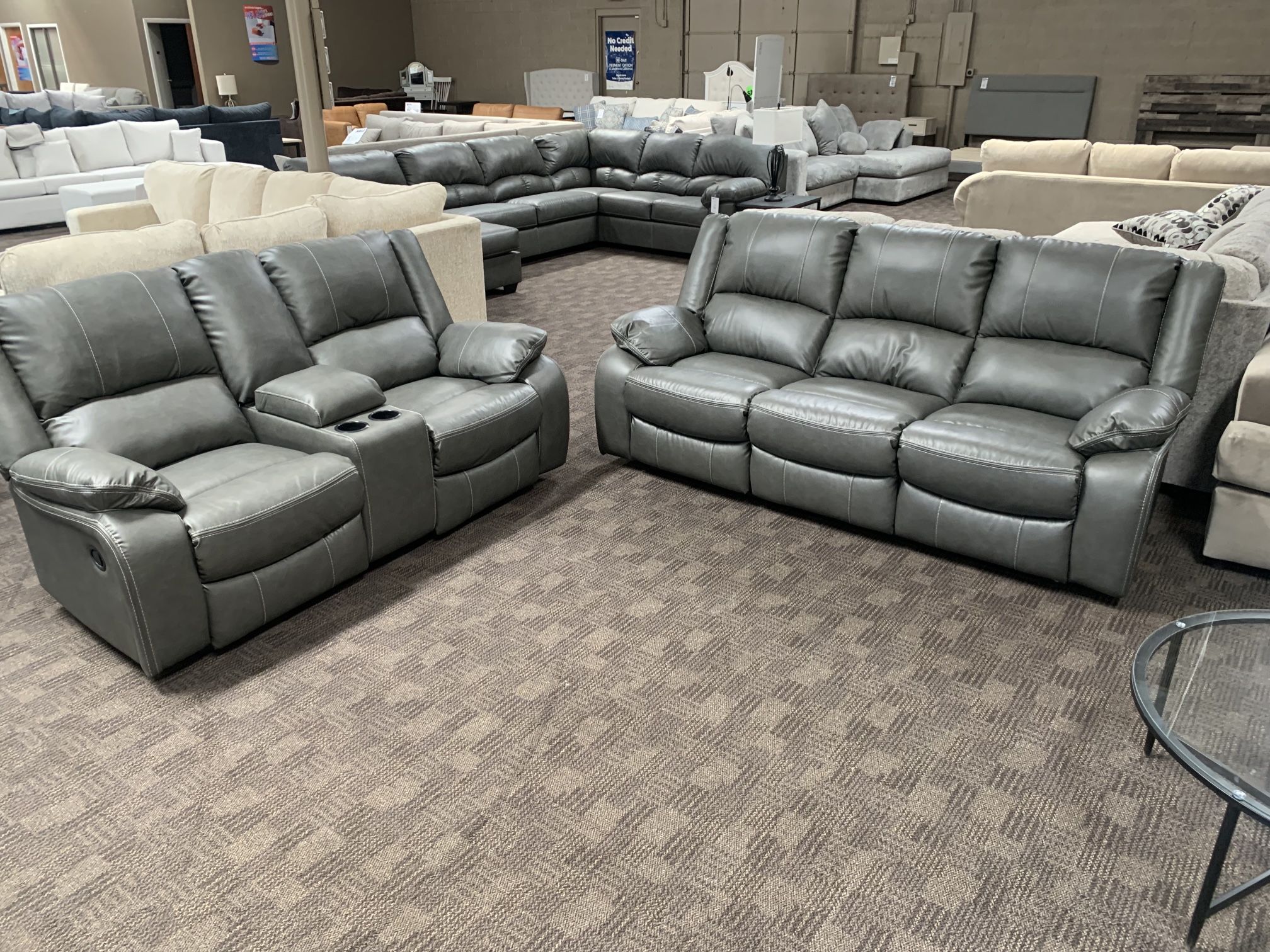 Brand new leather reclining sofa and love seat. Beautiful modern grey leather. Pick up or have it delivered! Take home for $50 down. Payment plans available