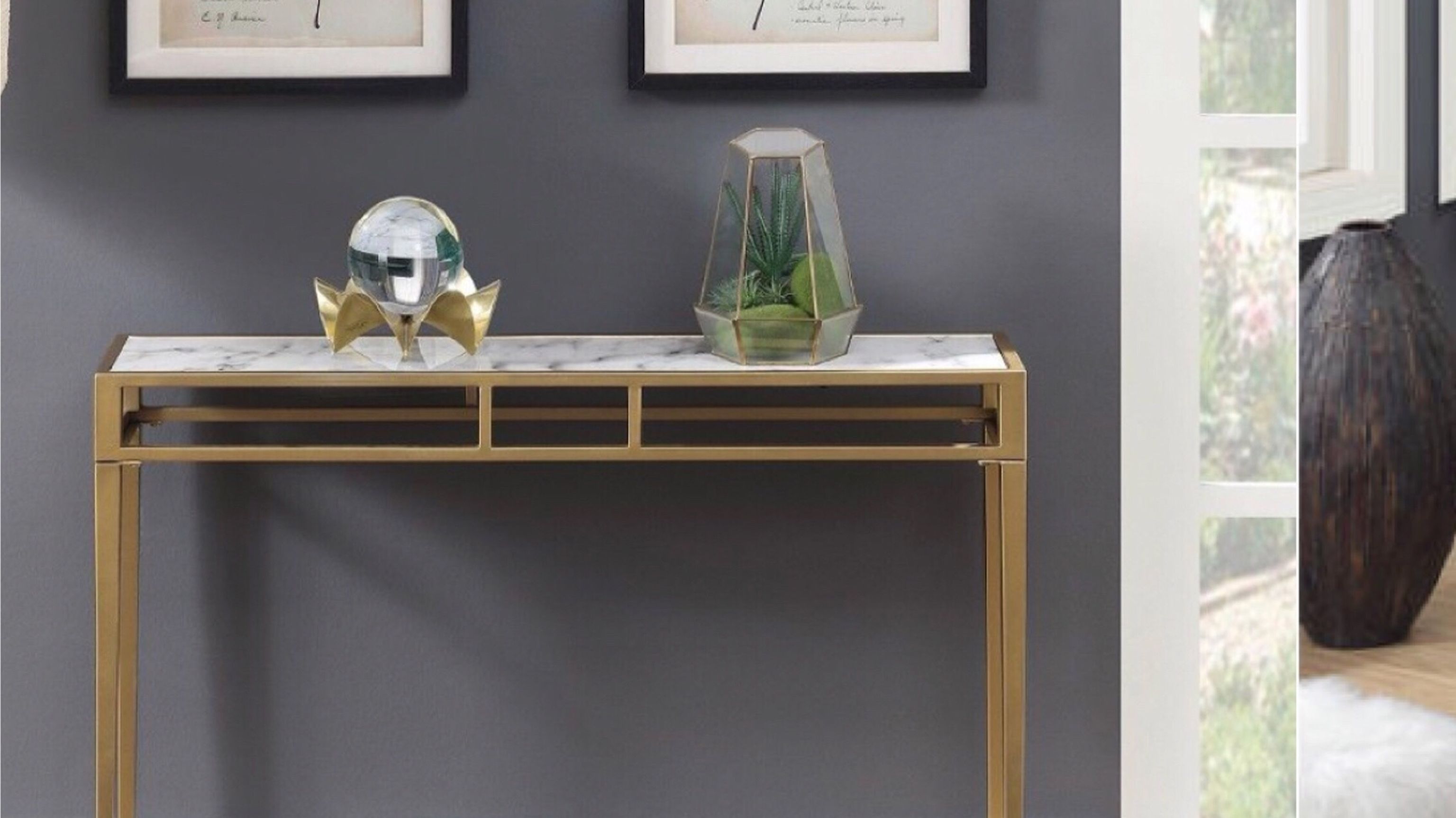 Brand New in Box. Retail for $299+taxes. Rich Gold Iron Frame. Gorgeous Faux Marble Tempered Glass Top. Dimensions: 42"L x 9"W x 30.25"H