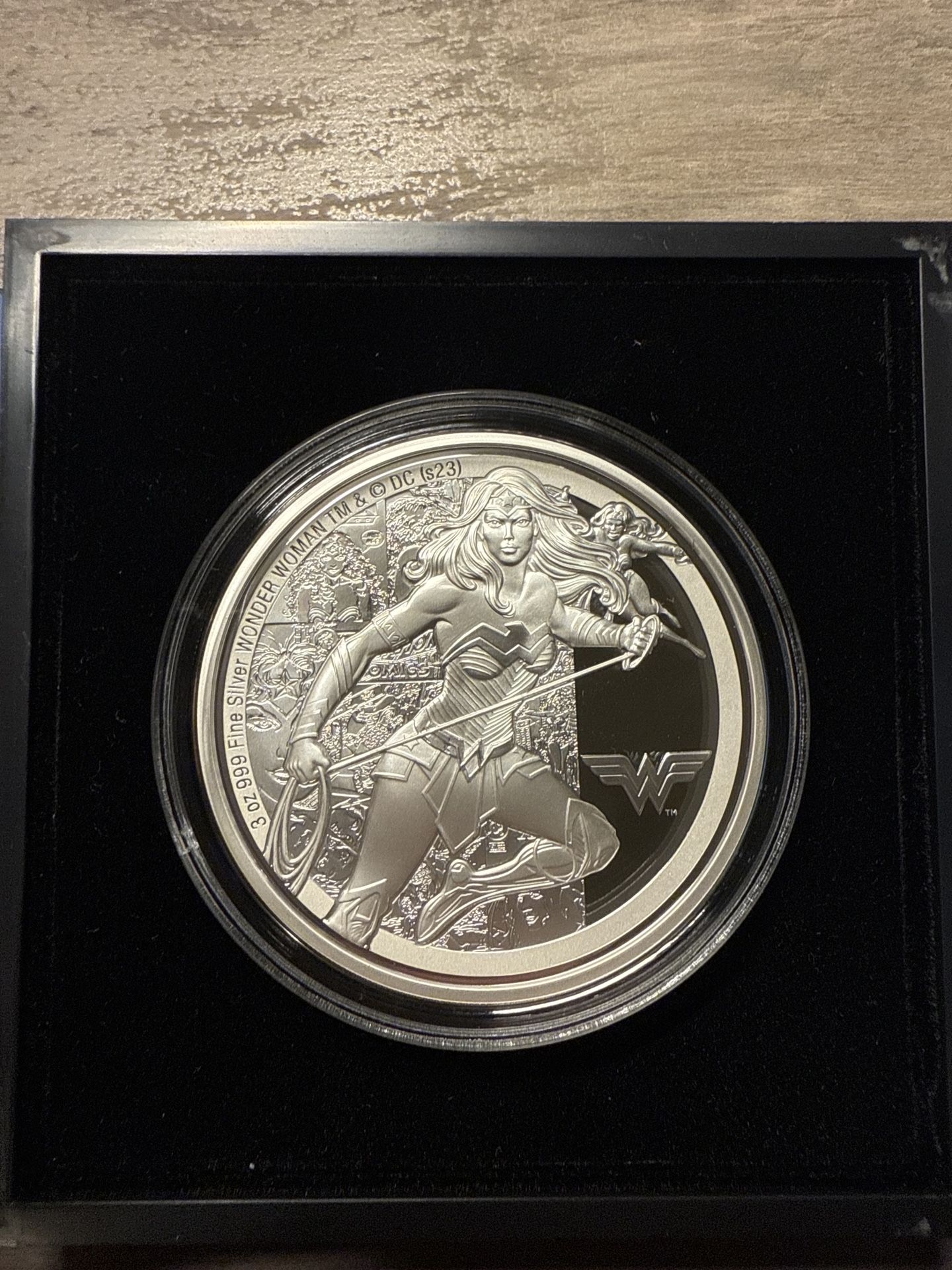 Sell or Trade Wonder Woman Classic • Year: 2023 • Issuer: New Zealand Mint • Country of issue: Niue • Denomination: 10 Dollars • Metal: .999 fine silver • Weight: 3 troy ounces • Mintage: 1,000 total (very low) • Packaging: Original box + COA
