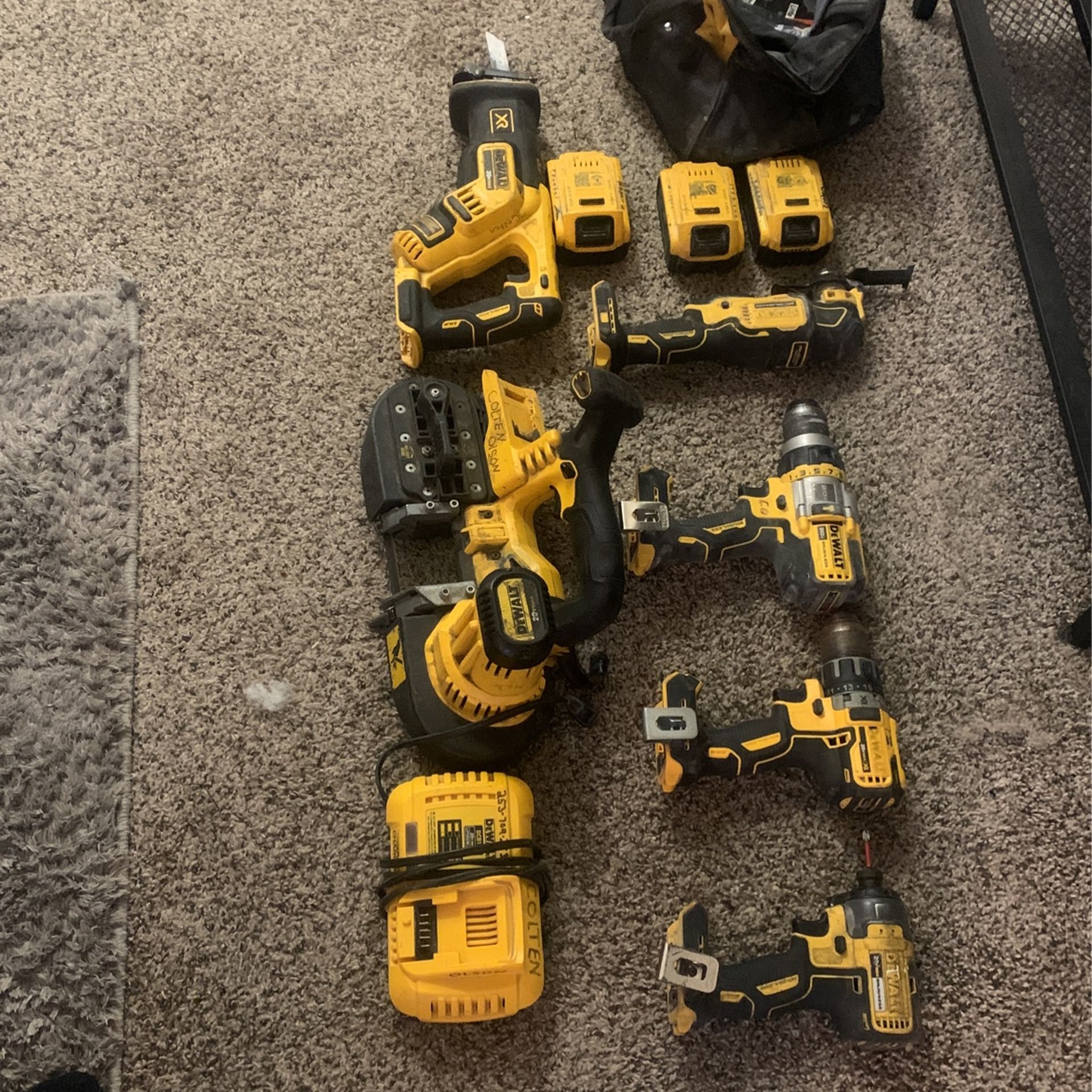 Dewalt 20V brushless Multi tool 70$ Dewalt 20V max lithium ion 4 AH 55$ Dewalt 20V max lithium ion 4 AH 55$ Dewalt 20V max lithium ion 4 AH 55$ Dewalt 20 V brushless 3 gear drill (big version)90$ Dewalt 20V max Xr 2 gear drill 80$ Dewalt 20V max brushless impact 65$ Dewalt 20 V max XR sawzall brushless 120$ Dewalt 20V max portaban 120$ Dewalt 20 V max lithium ion fast charg