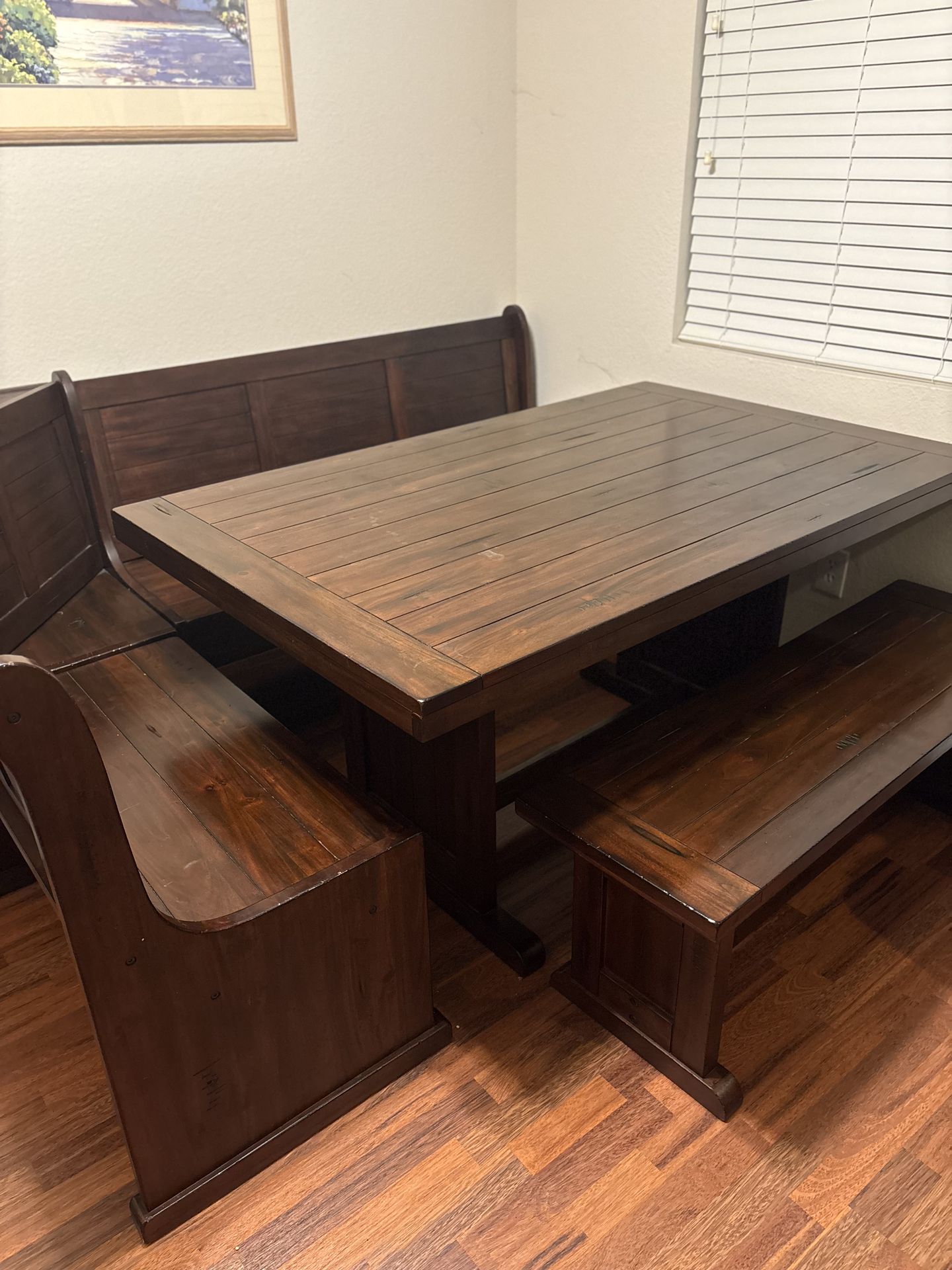 This Dark wooden dinner table ranges from 2(contact info removed) dollars it has two bench seats that connect and one free branch seat. It’s only a couple years old Offer Price is $0-$2000