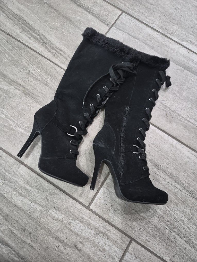 Knee High Black High Heeled Boots With Fur
