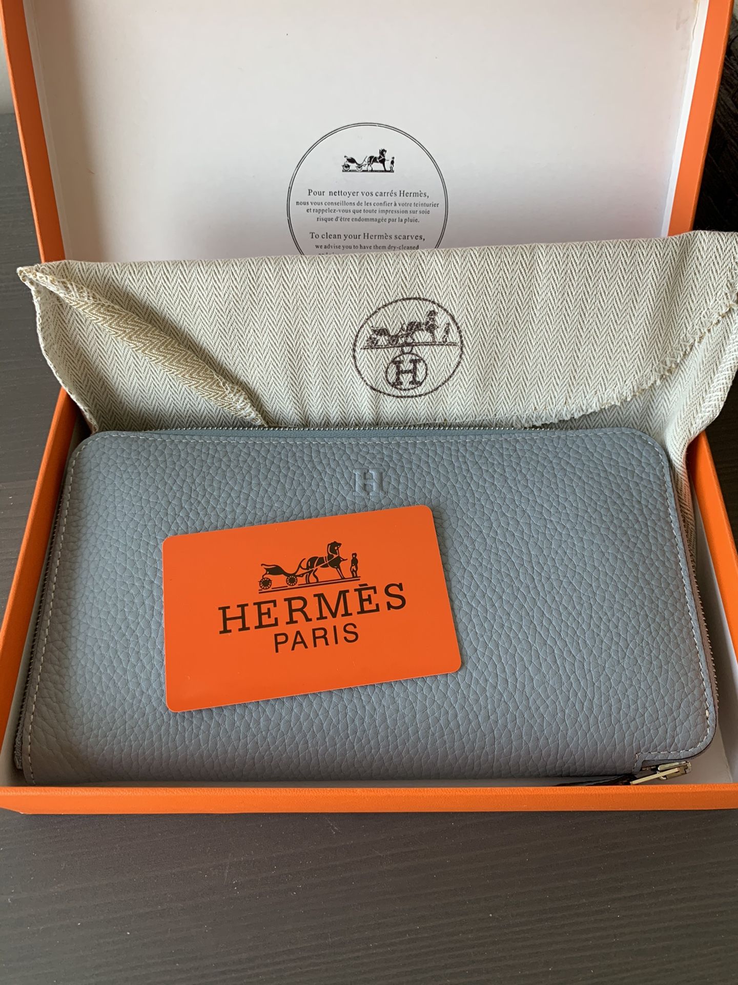 New designer like wallet - comes with box and dust bag Beautiful leather, baby blue zip wallet Asking $100 OBO