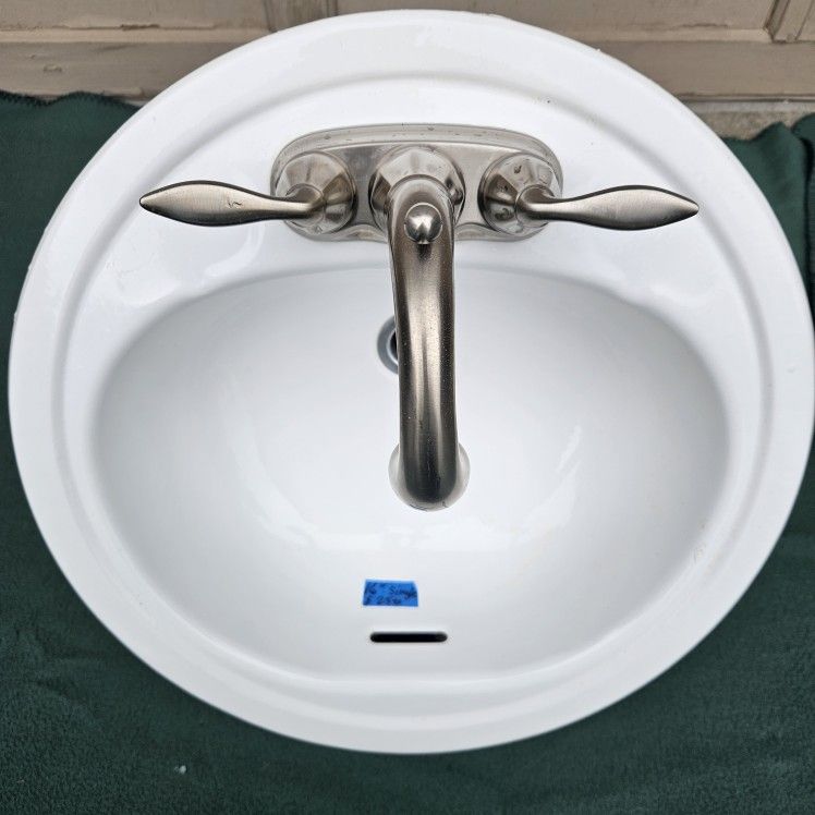 Used white 16" round bath room sink. Comes with stainless steel braided supply lines.