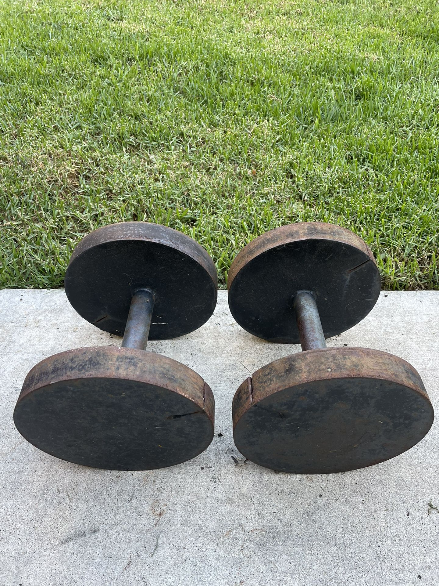 Iron dumbbells with a 1.5” grip great for forearms. 56lbs