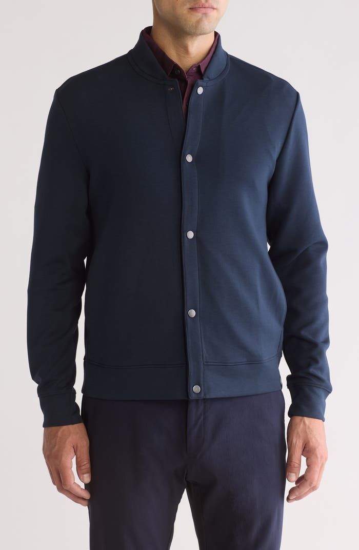 Perry Ellis. Long Sleeve Sleek Fleece Snap Bomber Jacket. Black. XXL. Fleece creates a cozy jacket that features a bomber jacket silhouette and a lightweight construction. In great condition. Perfect for work or over golf. Beautiful to wear out and not too formal. Shop closet and bundle on one shipping fee.