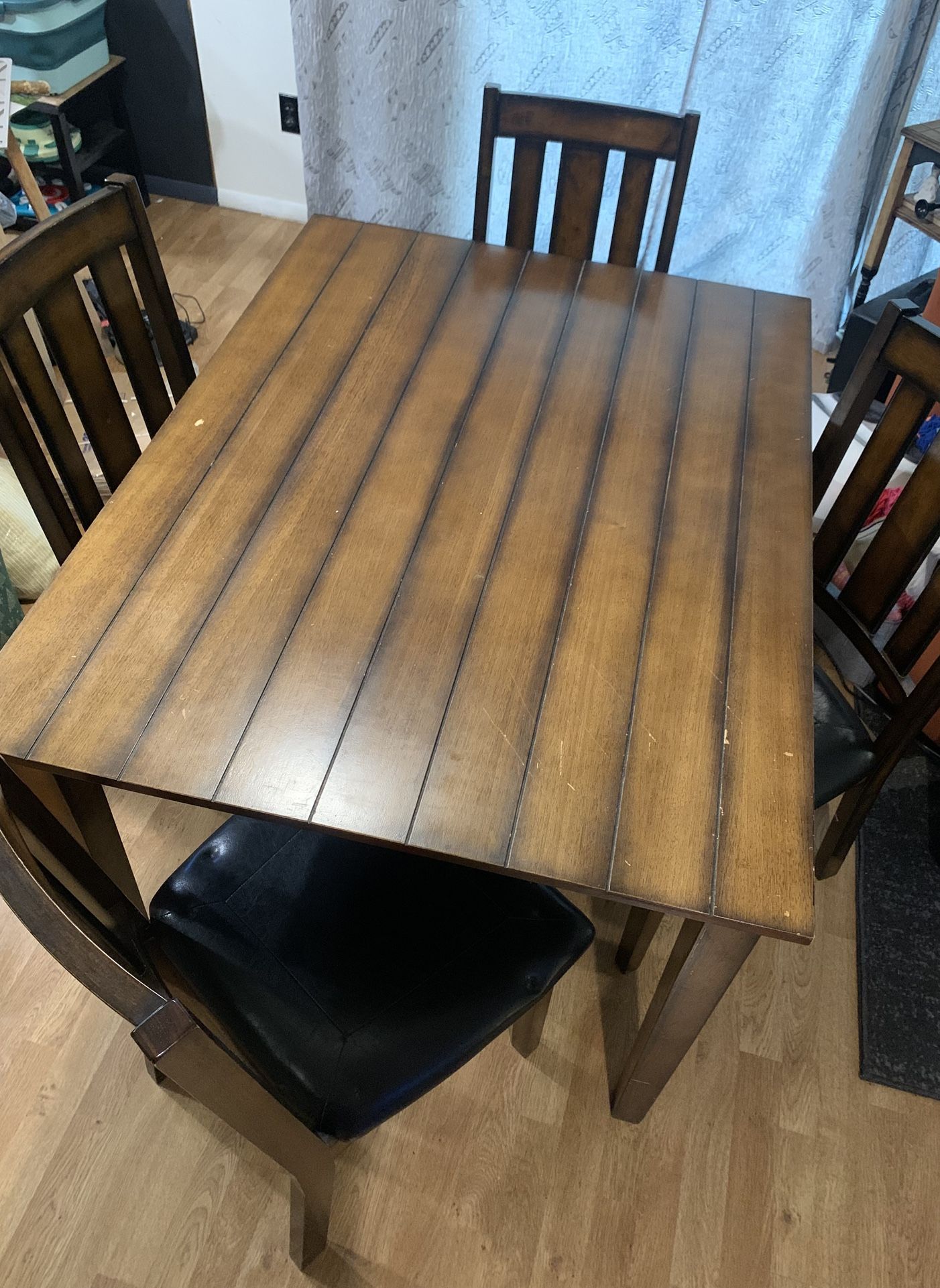 Big Lots brand (2014) dark oak veneer wood dining table and four chairs. Faux leather padded dining chairs included.