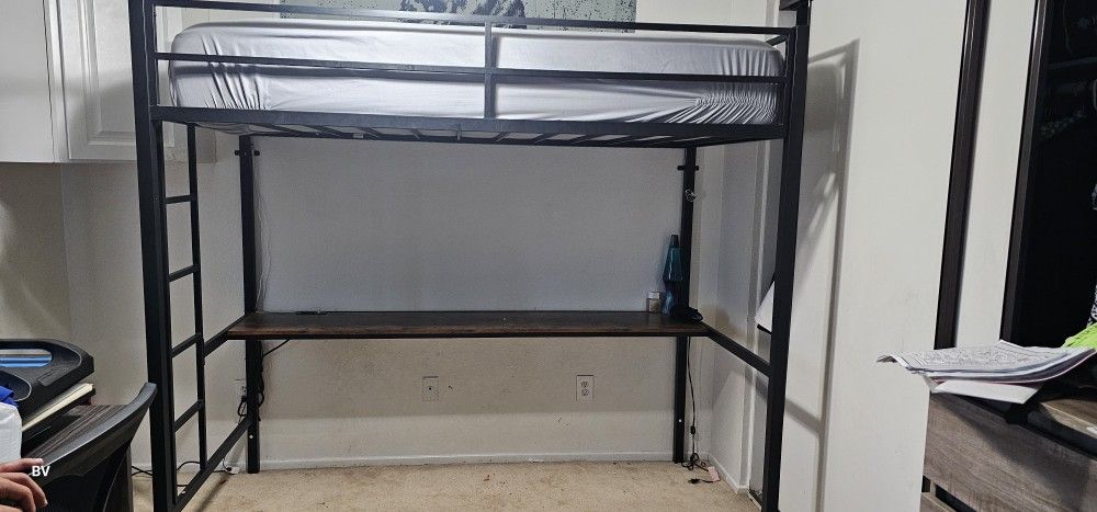 Twin size loft bed with desk and led lights. Twin size mattress included