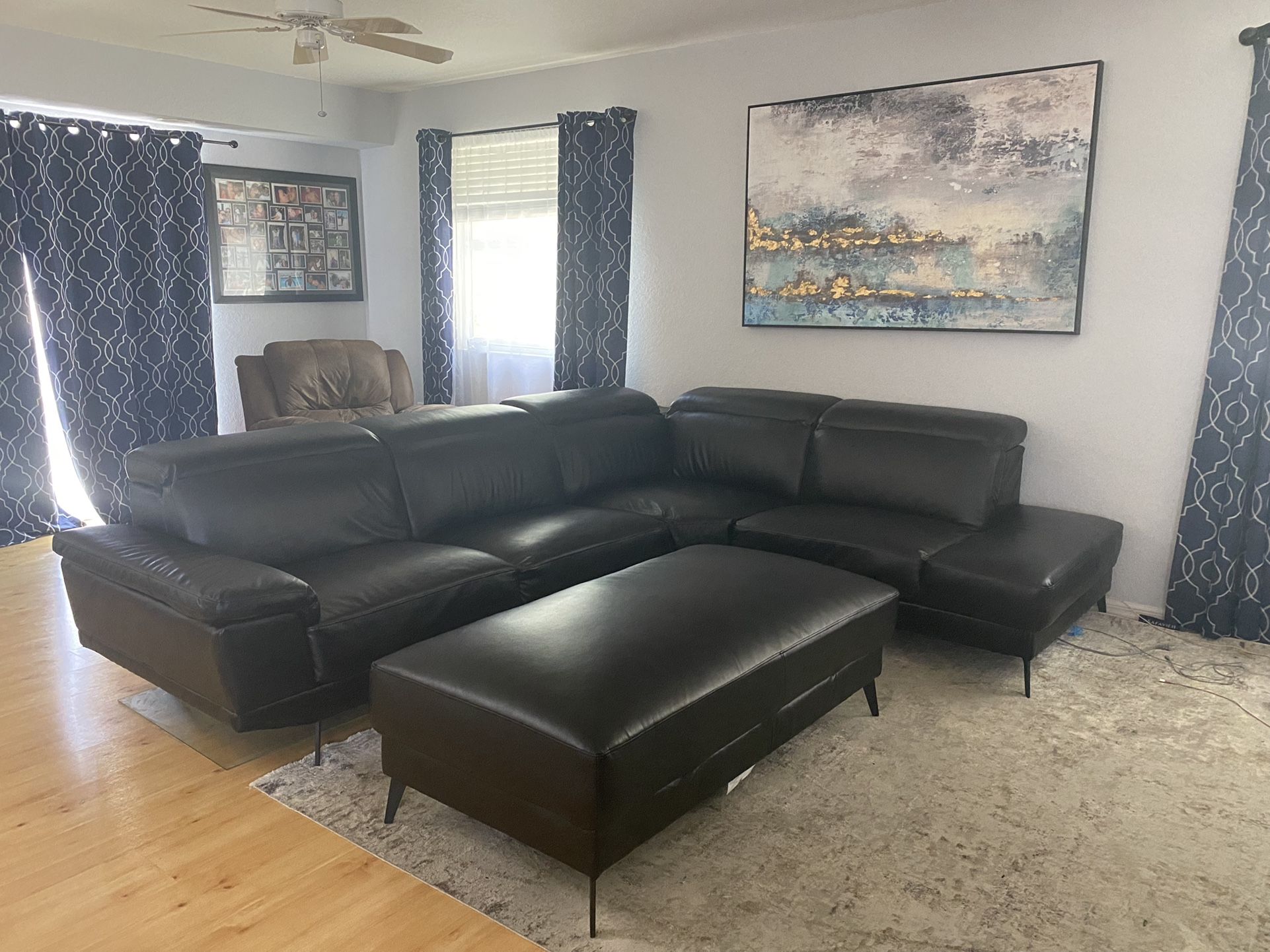 Black leather sectional with ottoman set. Purchased couple weeks ago, but it is not right fit. Barely used.