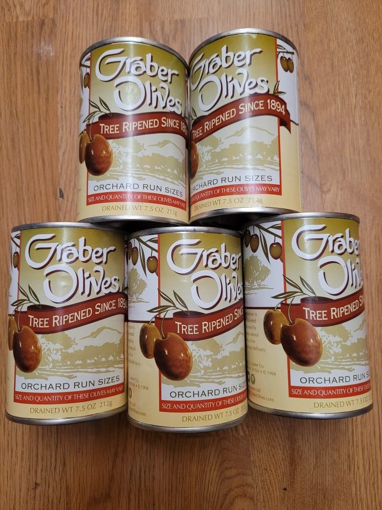Graber Olives- Orchard Runs Tree ripened since 1894 Fancy olives. Great for holiday celebrations. Graber Olives are different: Their succulent texture is due to full tree-ripeness. They are carefully harvested by hand when cherry red in color. Discover the goodness of this unique food delicacy. Retail - $15.75/ can (Sold Out on website 4/pk $56.35)