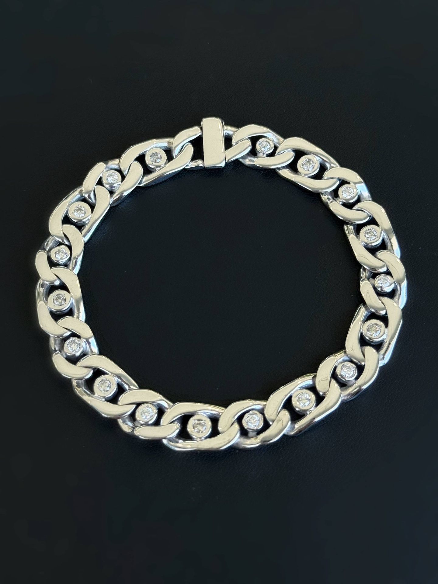 This gorgeous bracelet is made of solid 14k white gold with 18 natural diamonds round shape. This bracelet is made in curb style but with stones in the center, which makes its design truly unique. Total weight of diamonds is approximately 2 carats. They are Vs-Si mixed, G-H color. Total weight: 36.7 grams. Size: 8 inches length and 9.5mm width. The best choice for you. Perfect gift! β€οΈππ We buy Rolex and Audemars, patek . Do layaway in vipawn Boca Raton π₯ππΈ