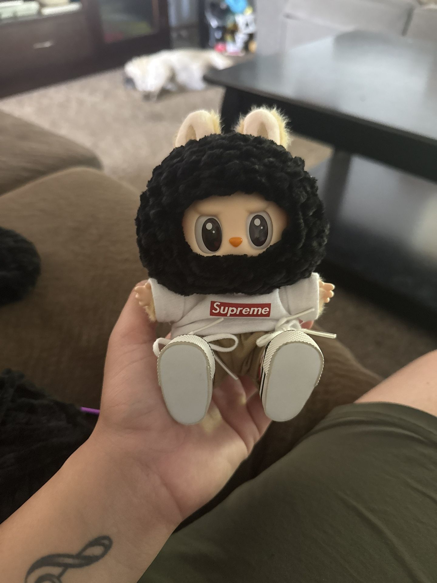 All crocheted or made by hand for all versions of labubus. Hole in top of beanie or ski mask for keychain to pull through. Black and red yarns are velvet chenille and the gray is regular yarn. If a curb chain is wanted, let me know the desired length. Beanies/Ski Masks $15. Chains $10