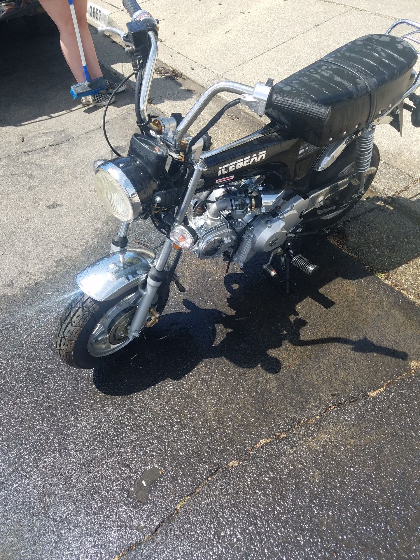 If the ad is up, it’s still available. This is a 2018 Ice Bear. It’s a Honda Trail 70 clone. We bought this new for our adult daughter to be able to go riding with us. She didn’t like it. We used it for riding around campgrounds and putting around the neighborhood. Only has 40 miles. It is a 125cc, 4 speed, semi-automatic transmission (no clutch). Has passenger pegs, headlight, blinkers, electric start but battery needs a charge. It’s not being used, would rather get something else than have it sit around. Also has disc brakes and all parts are easy to get. $1200. or best reasonable offer. Not interested in any trades. Thanks