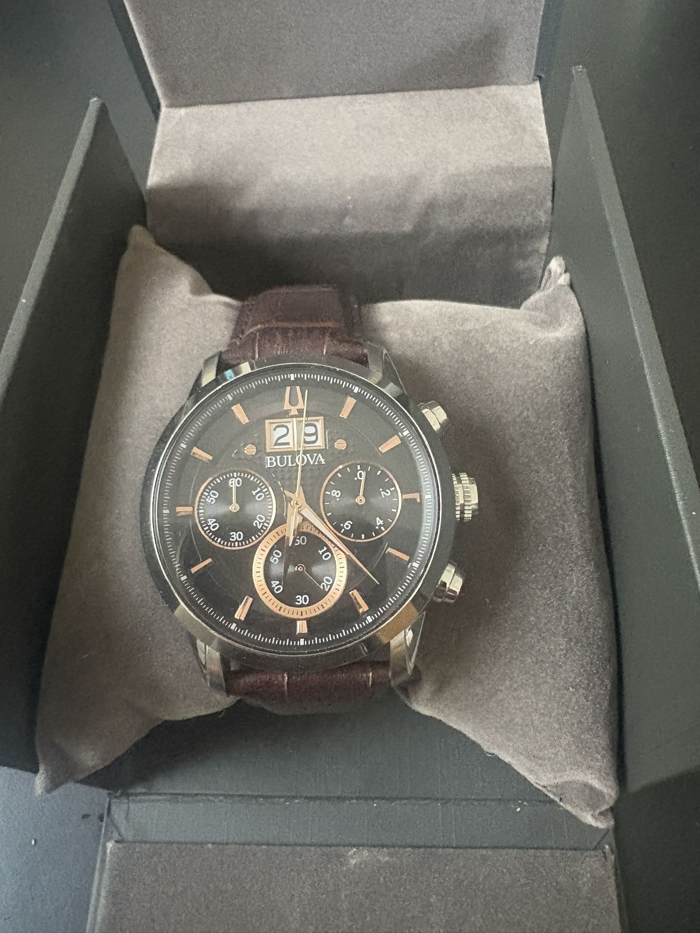 Beautiful wrist watch with leather strap band. Comes in nice case. Watch like new but needs battery.