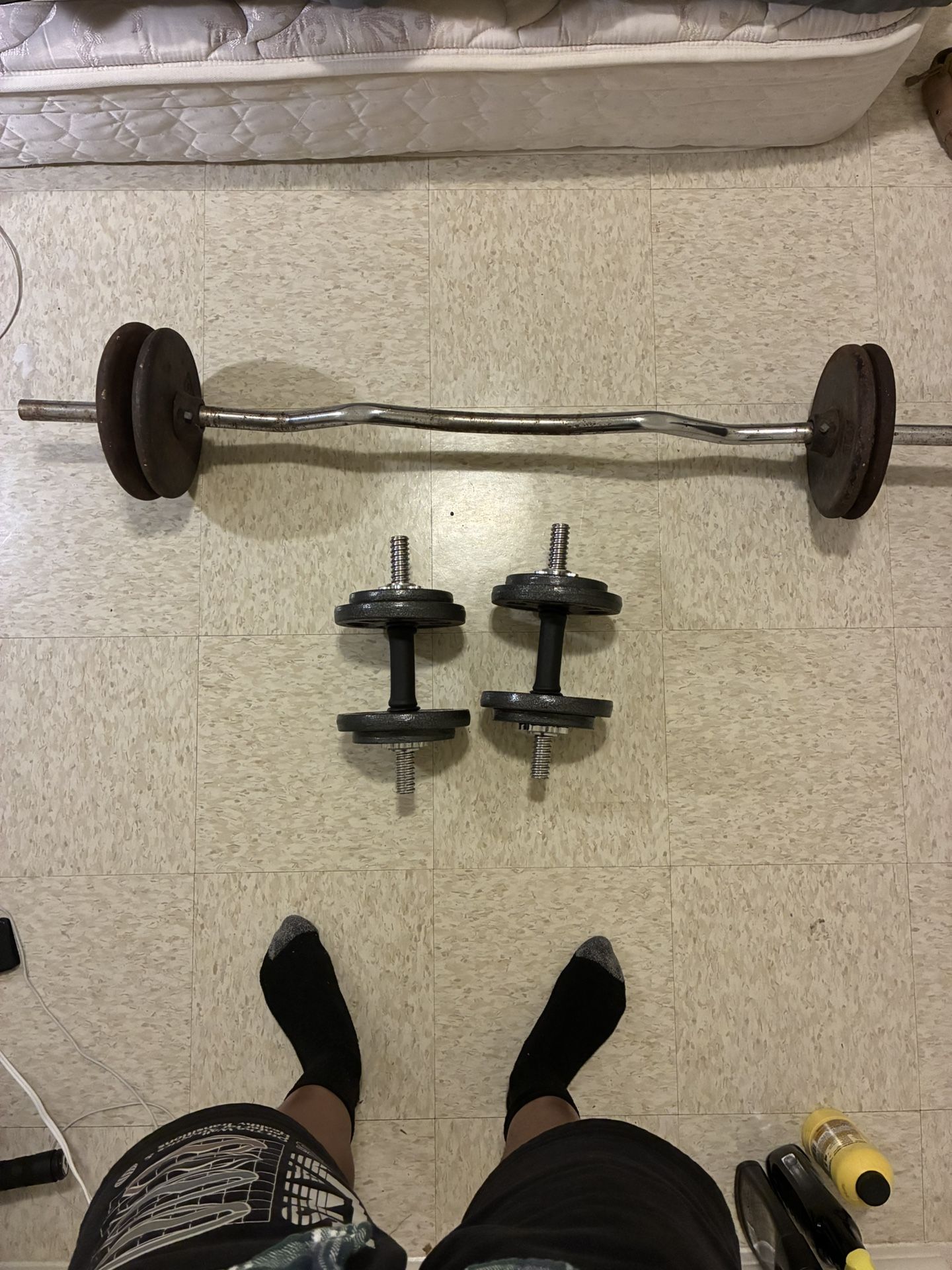 Dumbbells: x4 10lbs and x4 2.5lbs Curlbar: x4 10lbs