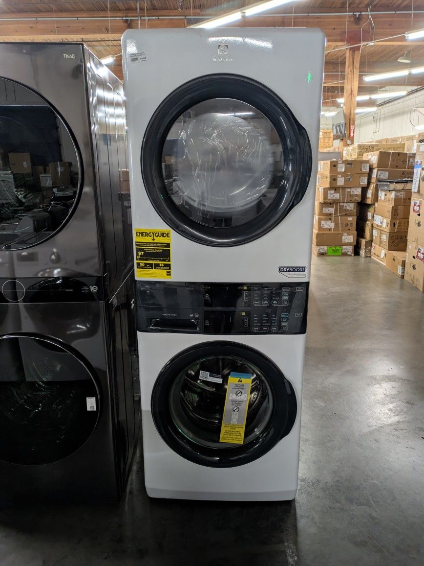 Electrolux ELTE7300AW 27 Inch Electric Stacked Laundry Tower with 4.4 cu. ft. Washer and 8 cu. ft. Electric Dryer, LuxCare® Plus Wash System, 20-Minute Fast Wash & 20-Minute Fast Dry, Extra Large Capacity and Reversible Doors (Two Outlets Required) National Appliance Liquidators Contact Lino