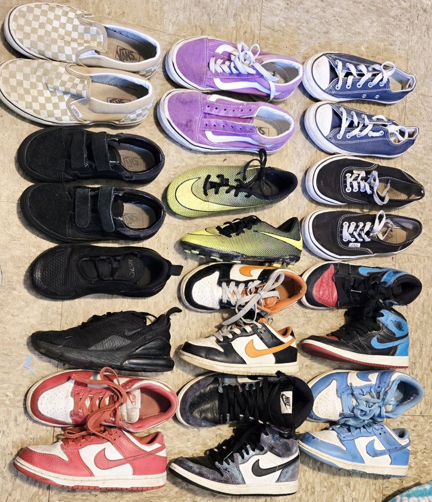 Kids Shoe Collection: Jordan, Nike, Vans, Converse, Dunks, Cleats Nike unc dunks -size 2y Jordan unc to chi -size 13c Vans black & white -size 3y Converse -size 13c Jordan 1 High -size 2y Nike Halloween dunks -size 13c Nike Cleats -size 1y Vans purple -size 3 Nike dunks pink -size 2y Nike air 270 -size 13c Vans strap black -size 1.5y Vans checkered -size 3 Buy all for $100 or send offer for an individual shoe
