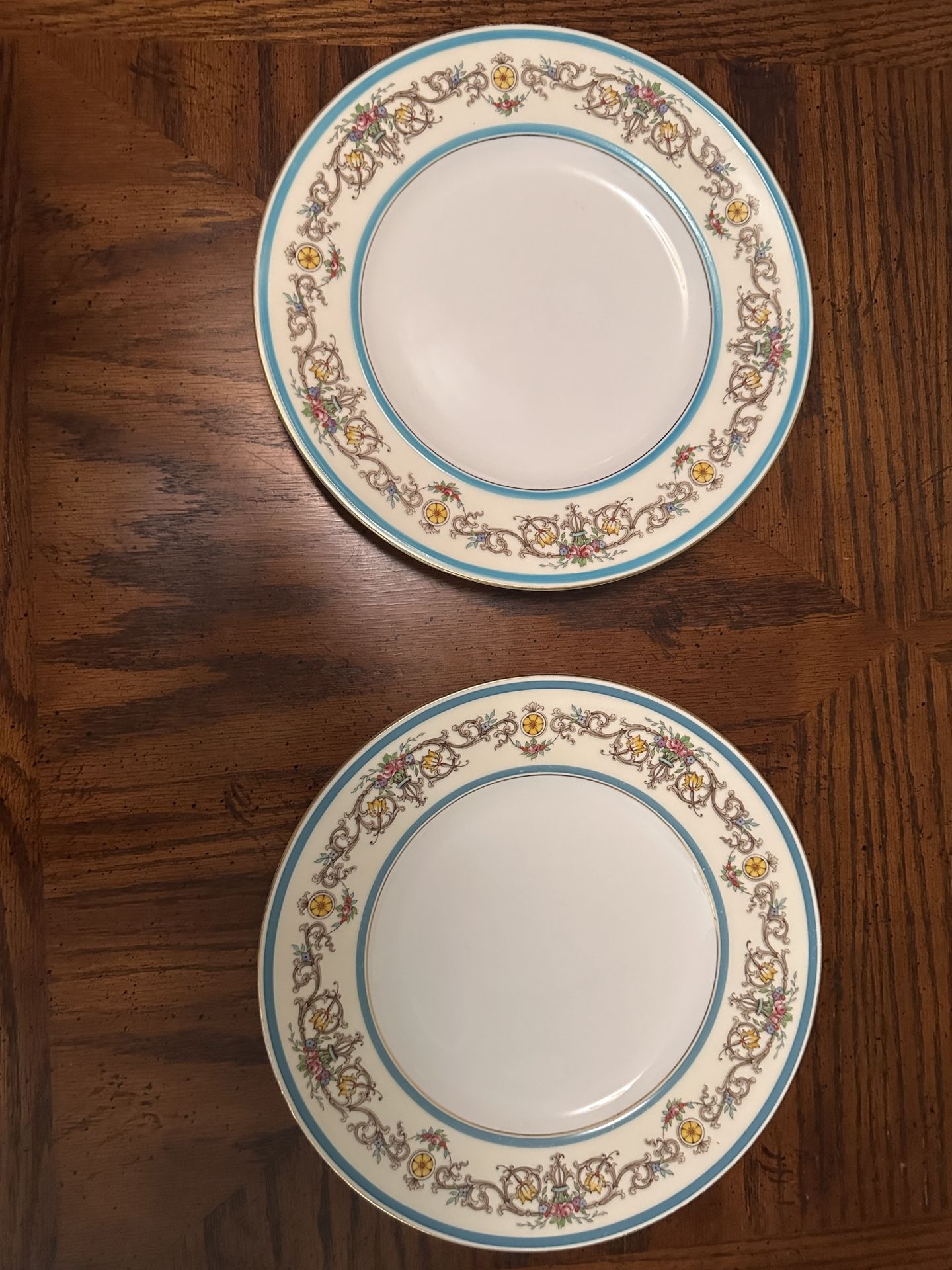 Unfortunately unable to track the lot these were produced for however they are comparable to the Henley design produced by Minton China. Elegant design with texture along the outer edges lined with gold on inner ring and on the outside of plates. No chips nor cracks however the gold has some imperfections along the edges due to wear and tear. 10 3/4” diameter Feel free to ask any questions prior to purchasing.
