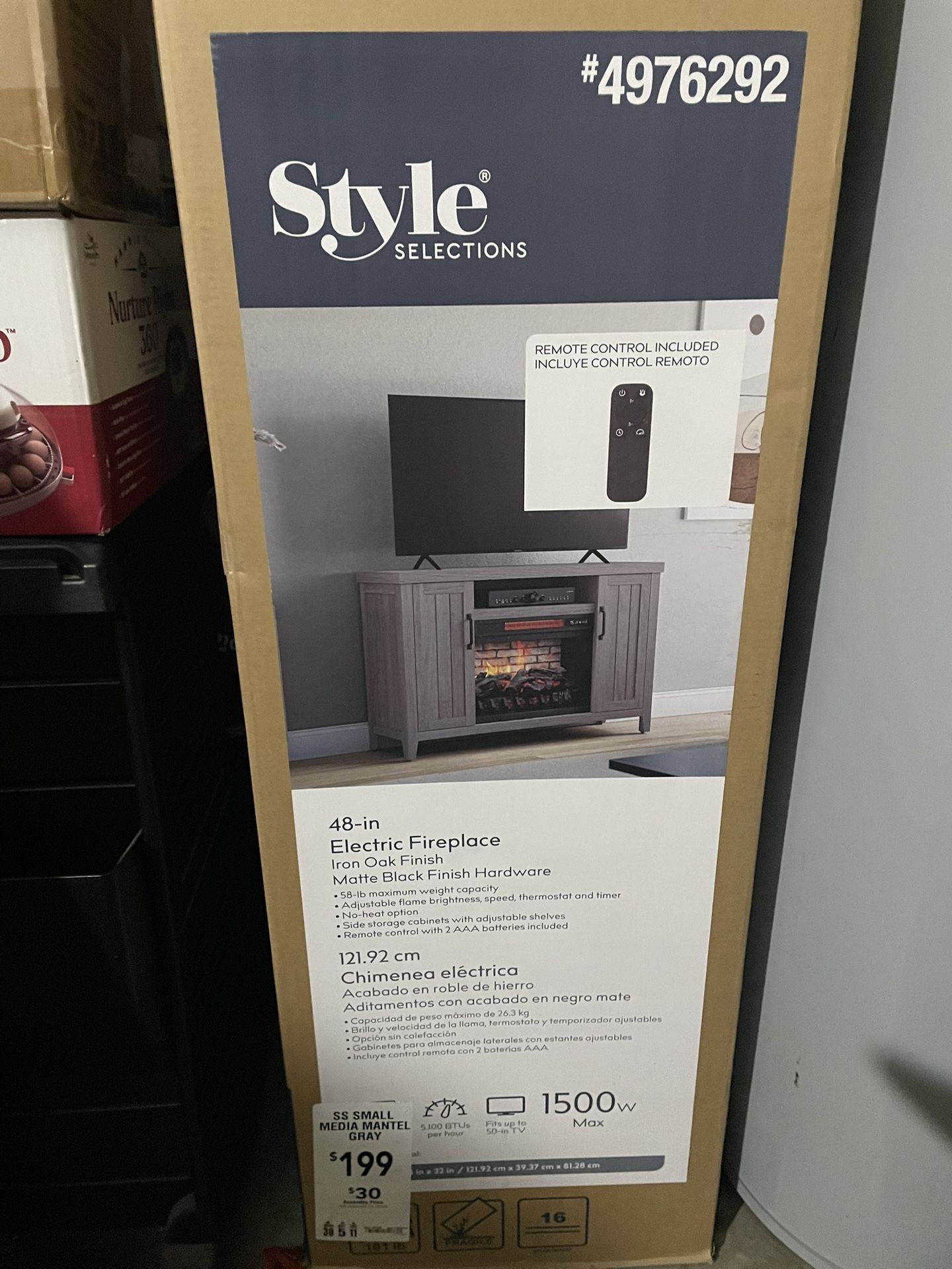 Electric fireplace Has side cabinets for storage Comes with remote and batteries Adjustable flame, Thermostat, and timer 48in x 15.5in x 32in