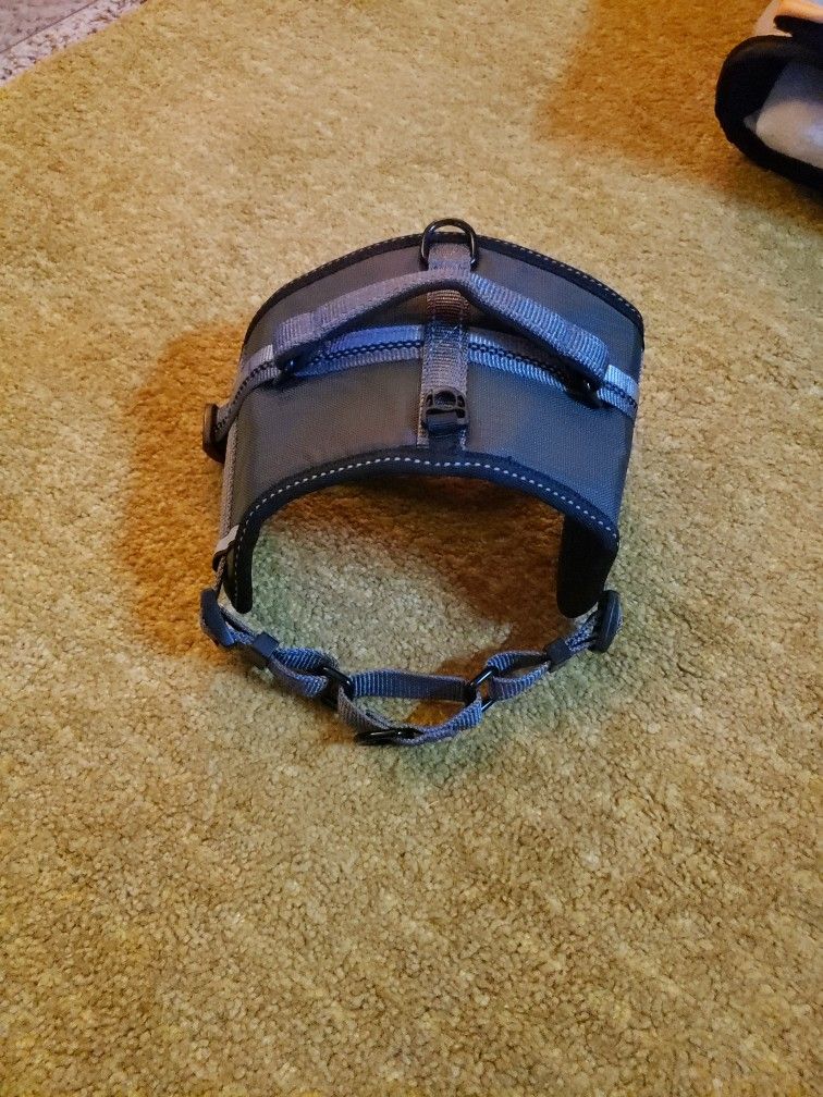 Vest style dog harness for dogs with girth measuring approx. 17"-21". Has a leash clip, handle, and accessory loop (to attach watse bags, ect.) Along the bag, and a leash clip with a martindale loop along the chest strap for training.