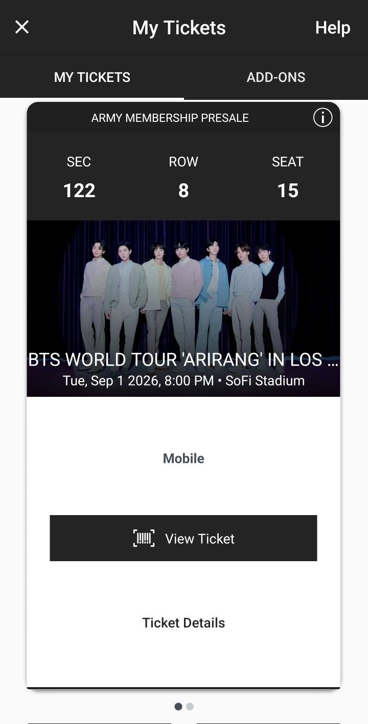 Selling 2 tickets to bts in sofi on 9.1.26. Section 122 row 8 seats 15 and 16. Price is per each ticket. Can meet up and transfer through ticketmaster only.