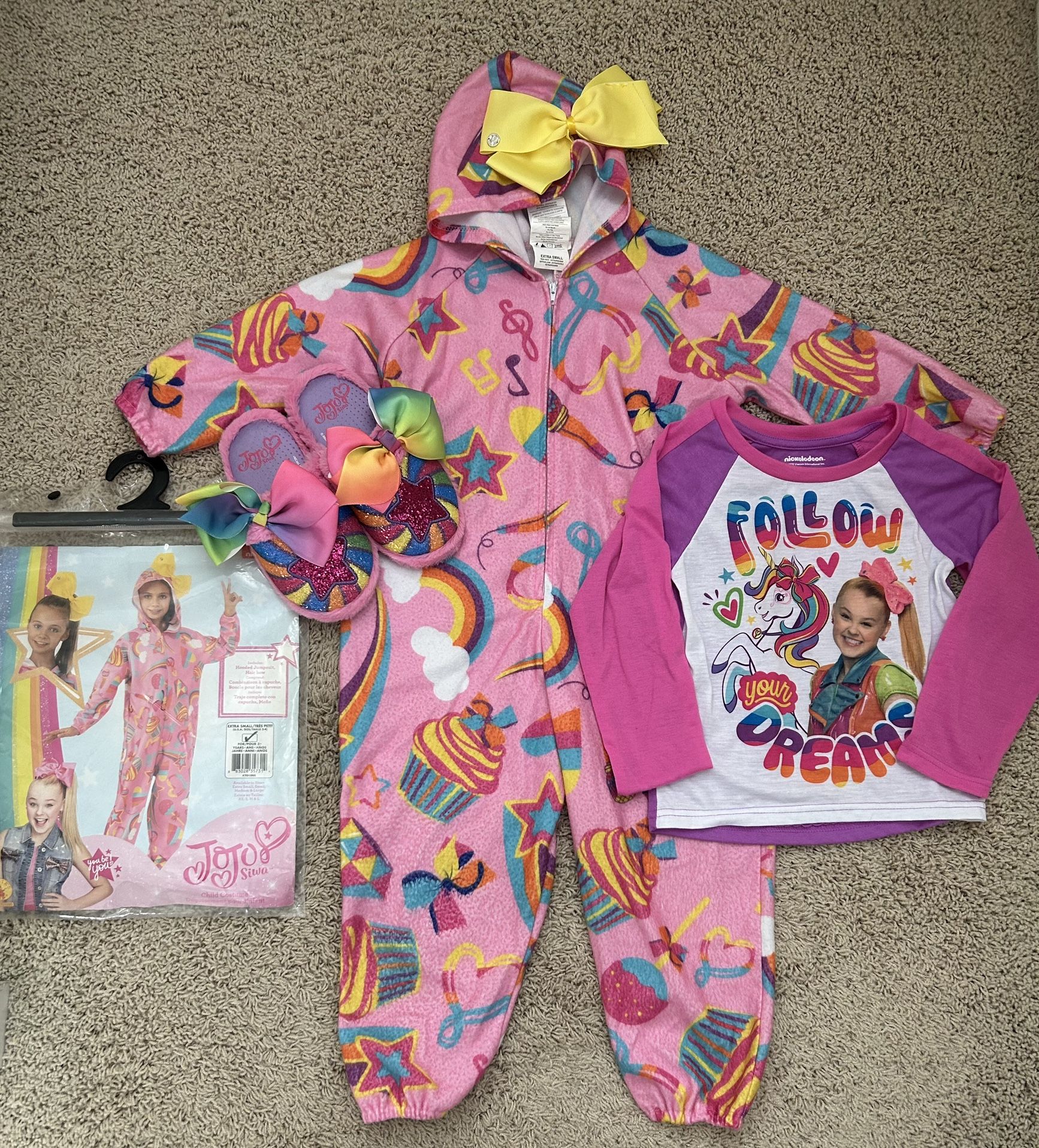 Rubie’s JoJo Siwa Costume Girls size XS Hooded Fleece Jumpsuit Bow, size 11/12 Slippers and size XS 4/5 sleep shirt The hooded fleece costume measures approximately 15” across laid flat and 33” from shoulder to bottom. My daughter liked to lounge in this in the winter as it was nice and warm. I think per the package it is 3T-4T. The slippers are size 11/12. The sleep shirt is size 4/5 and has a tiny hole in the sleeve from the original price tag. From a non-smoking, pet-free home. Pickup in Eastvale off of Limonite.