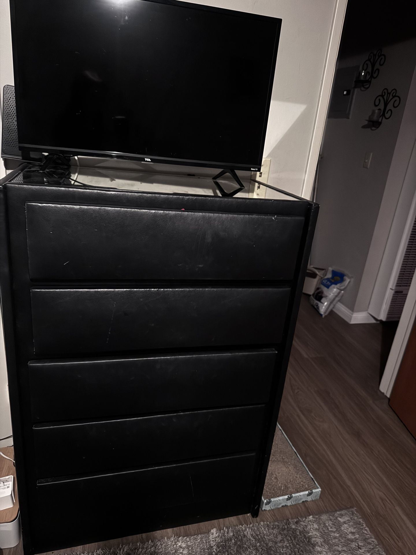 Selling a black faux-leather 5-drawer dresser with a glass top. Good condition with normal wear, all drawers open/close. Clean, smoke-free home. Perfect for bedroom, closet, or apartment storage. Pickup in Dana point (46” H × 31” L × 18” W)