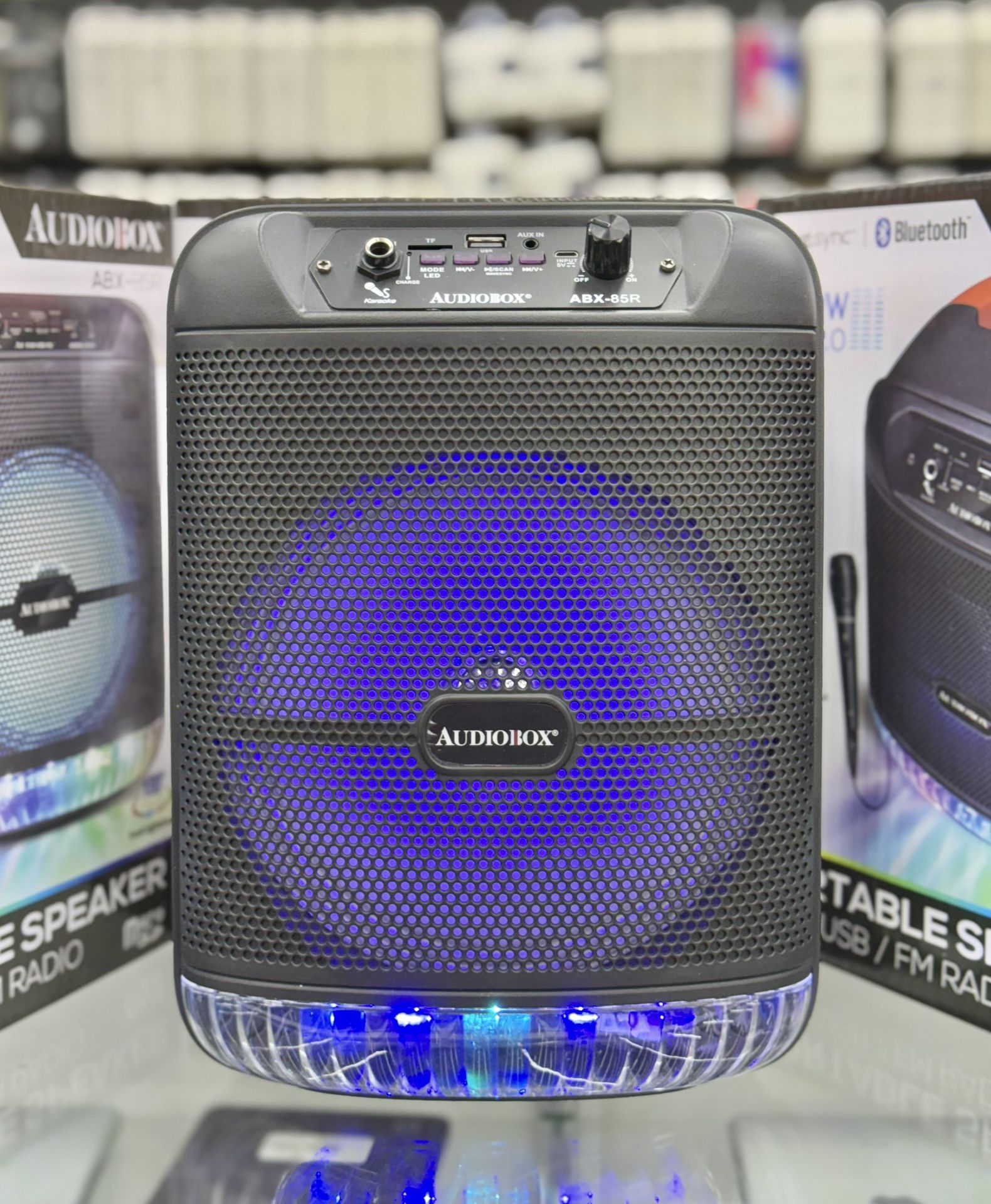 - WaveSync technology - Music power 1000 Watts - 180 light show + Woofer lights - Dual channel sound board - Main channel- Bluetooth. USB, TF, FM or AUX - Auxiliary input: 3.5 mm jack - One ¼’’ Microphone jack - 8’’ woofer - Built-in 1200mAh 3.7 Lithium-ion battery - Comes with wired microphone and USB Charge Cable - No Copyrights to the music