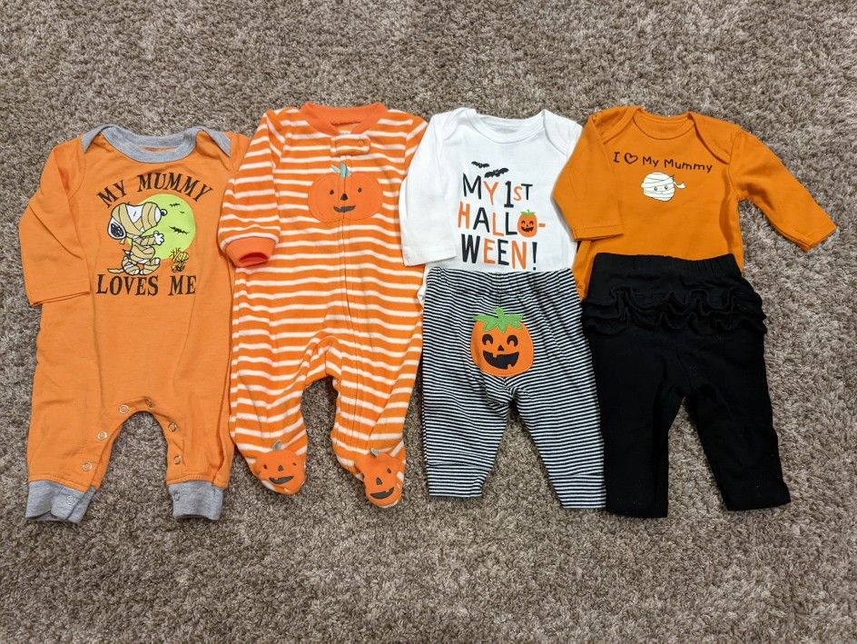 1 fleece sleep and play pajama, 1 one piece romper and 2 onesies with pants sets.