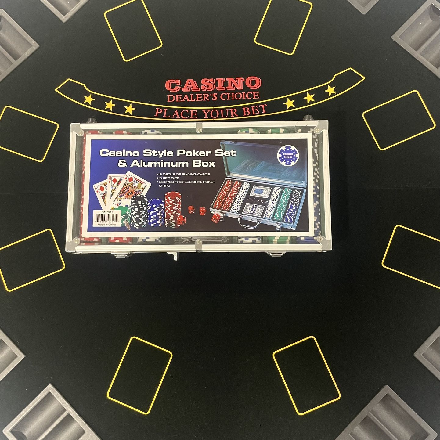 FOLDABLE POKER TABLE TOP For up to 8 players 42’ diameter Casino Style Poker Set & Aluminum Box • 2 DECKS OF PLAYING CARDS • 5 RED DICE • 300PCS PROFESSIONAL POKER CHIPS