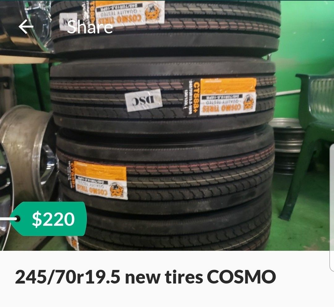 Selling BRAND NEW TIRES COSMO size 245-70R19.5 (16 PLY) all position tires. Asking 220$ EACH TIRE. Price includes installation. For more information send me a message. WE OFFER ROAD SERVICE FINANCING AND WHEEL BALANCE AVAILABLE Vendo LLANTAS NUEVAS MARCA COSMO medida 245-70R19.5 (16 LONAS) toda posición. Precio 220$ POR CADA LLANTA. Precio incluye instalación. Para mas información Mándame un mensaje. OFRECEMOS SERVICIO A DOMICILIO BALANCEO Y SERVICIO ADOMICILIO DISPONIBLE