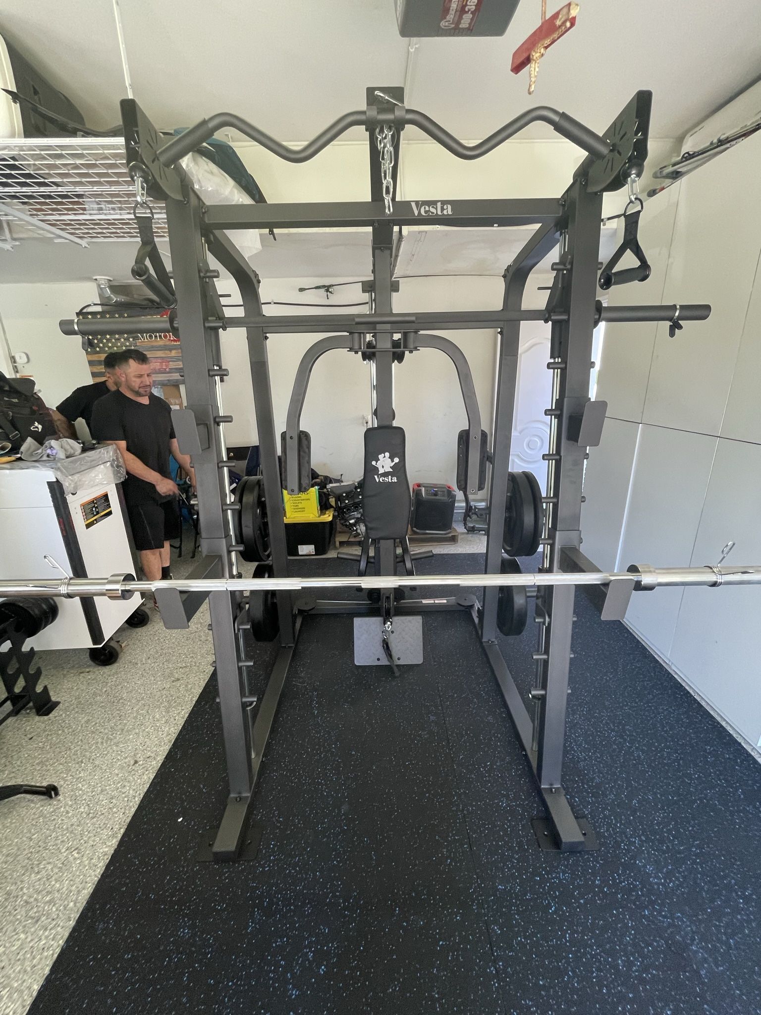 Includes Gym Equipment w/Weights! Let Me Help You Create Your Home Gym! New In Box! FREE DELIVERY AT FULL PRICE!Click Profile For More Gym Listings! Only Account! Cash / Venmo / Credit Cards / Finance Available! WARRANTY INCLUDED The Vesta Multi-function Smith Machine SM2001 is equipped with different strength machines and exercise station to bring the full gym experience to your home gym. It is designed to have a variety of exercises within one compact design The Ultimate ALL-IN-ONE Machine: Smith Machine Squat Rack Functional Trainer Lat Pulldown Weight Bar Preacher Curl/Leg Lever Bench Press Butterfly Arm Dimension for SM2001 Machine: 84“H x 74“L x 83"W Dimension for FID Bench: 36"H x 73"L x 19"H Upgrades or Add Ons •Free Switch to 245lbs Cast Iron plates 45s/35s/25s/10s/5s/2.5s •$40 3ft by 3ft Rubber Mats •$90 4ft 20lbs Curl OLYMPIC WEIGHTS GYM EQUIPMENT OLYMPIC STANDARD WEIGHT SLED PUSH SLED WEIGHTS WEIGHT PESAS SQUAT RACK POWER CAGE SMITH MACHINE BENCH PRESS INCLINE DECLINE BARBELL BAR HEX BAR BUMPER PLATES ADJUSTABLE BENCH FLAT BENCH BENCH DUMBBELLS DUMBELL ADJUSTABLE DUMBBELLS KETTLE BELLS DIP STATION PULL UPS PULL DOWN BATTLE ROPE BOWFLEX POWERTEC POWERBLOCKS HOIST BODY SOLID ROGUE FITNESS EXERCISE for