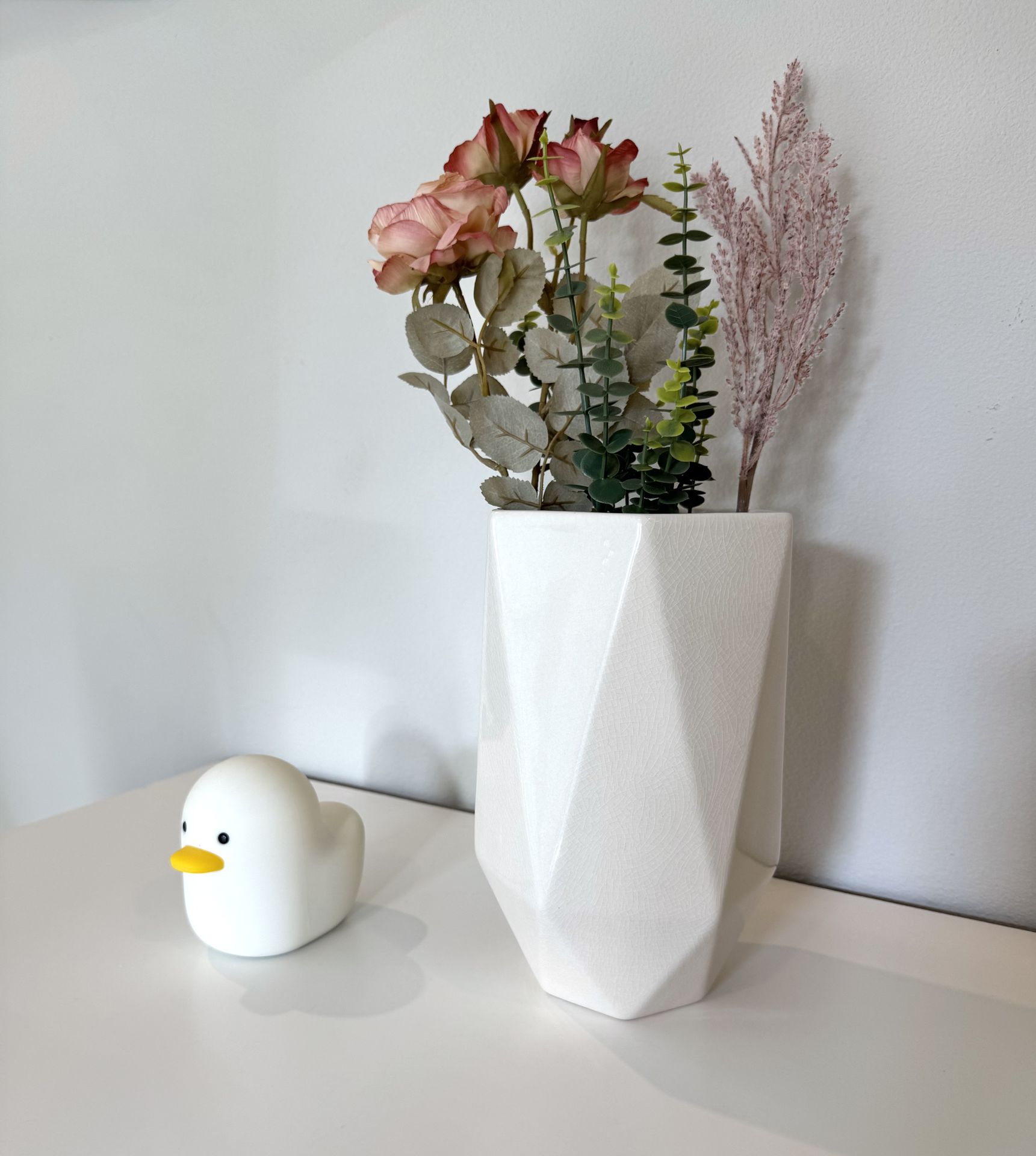 CB2 Liv Ivory Vase in ivory ceramic with a modern geometric design. Styled example shown in photos. Perfect for shelves, coffee tables, or entryway decor. Originally $69 retail. In like new condition, gently used in a pet-free and smoke-free family.