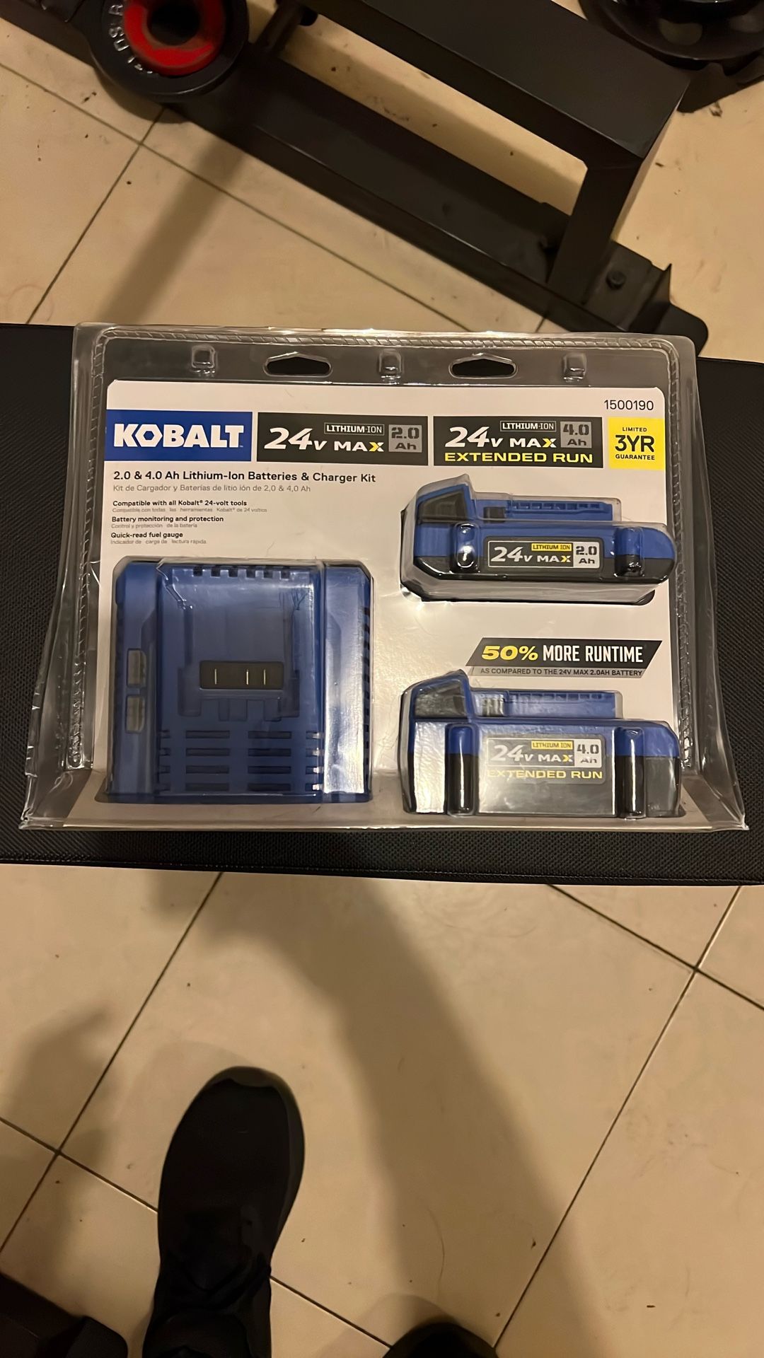 Battery kit for Kobalt tools: The perfect Kobalt Starter Kit to get your Kobalt 24-volt max bare tools started. The possibilities are endless! The starter kit includes a 2.0Ah battery, a 4.0Ah battery, and a standard 45-Watt charger. All will provide you with enough power to keep your tools working all day. Kobalt's 24-volt starter kit includes: 2.0Ah battery, 4.0Ah battery, and 45-Watt charger Both batteries feature a power indicator display to show the charge status whether it is on or off a tool Internal circuitry protects the batteries from extreme temperatures, over-discharge, and over-charge for longer life The 45-Watt charger will fully charge the 2.0Ah battery in 85-mins and the 4.0Ah battery in 165-mins sold as is where is Both batteries and the charger are compatible with all Kobalt 24-volt max cordless power tools (sold separately