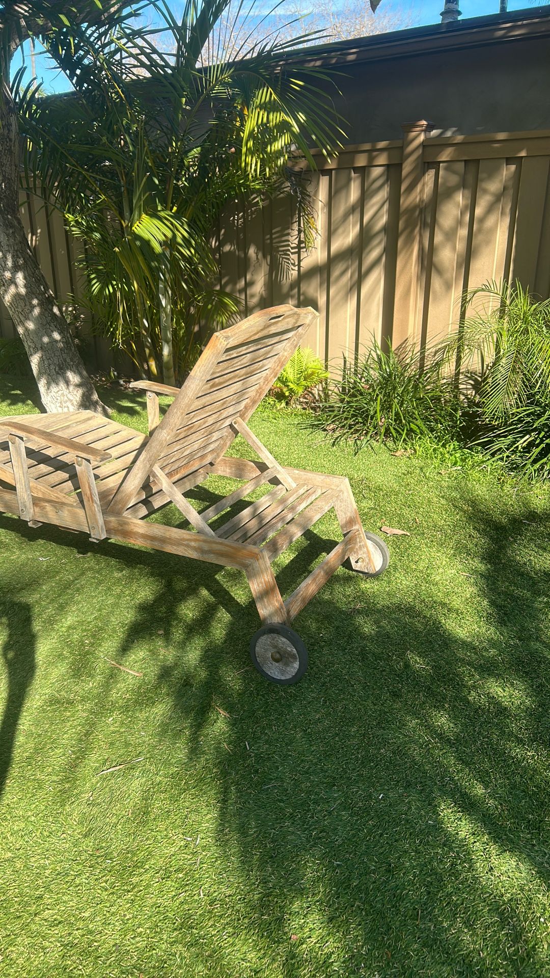 Not sure if it’s teak wood or acacia wood, in fair condition adjustable positions.