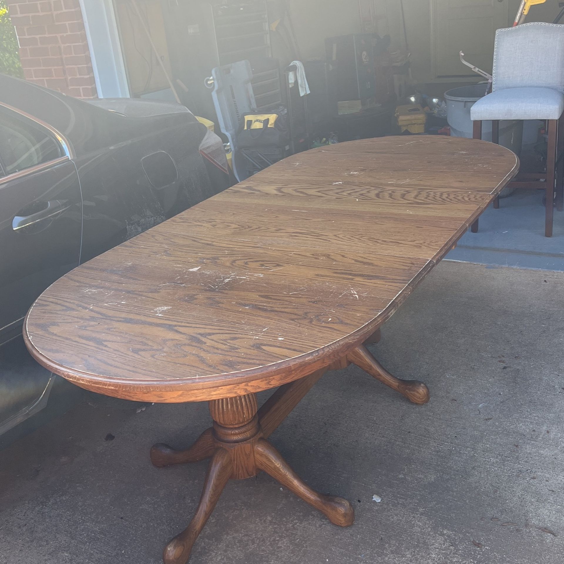 This is a real deal solid wood table. It’s in great condition. Because it’s actually wood, it can be sanded down and Re-stained. That wood make it look brand new. The table can be adjusted to 3 different sizes. It come with 2 leafs, that store underneath when not in use. It comes with 2 captain end chairs. 3 regular chairs And 2 custom built high chairs, we had made for our twins. All the chairs are made of the same oak wood as the table. I’ve had this in my family for a very long time and it has served us extremely well. I’d love to see it go to a family that will get good use from it. We are moving to a smaller house, and can not take it. I’m asking $300 for everything, but will listen to reasonable offers.