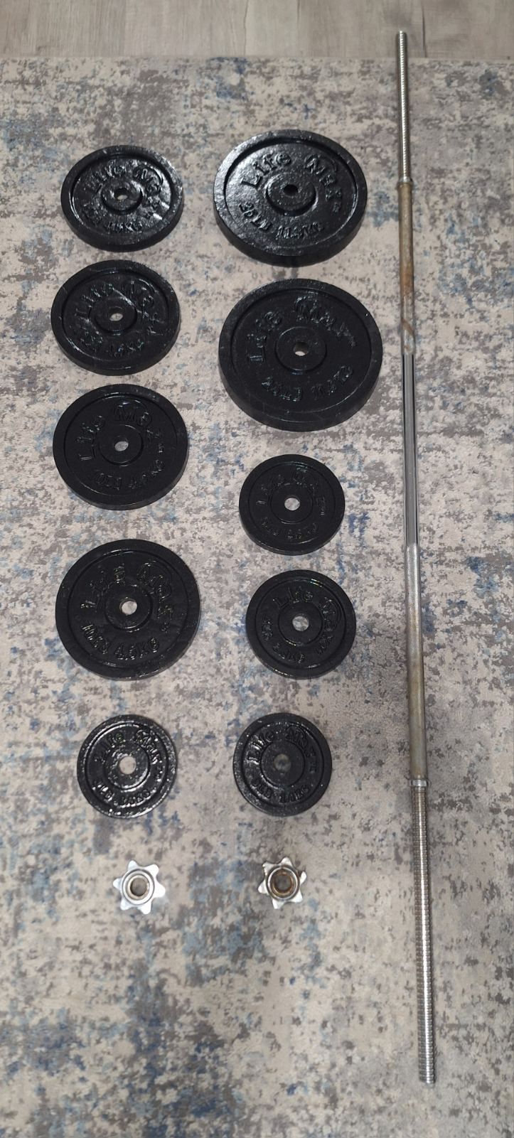 ποΈββοΈ Barbell Set with Weight Plates β Great Condition Barbell set for home workouts. Includes: βοΈ Barbell βοΈ Multiple weight plates βοΈ Spin-lock collars Perfect for home training: bench press, squats, deadlifts, arm and shoulder exercises. Good condition β solid and fully functional.