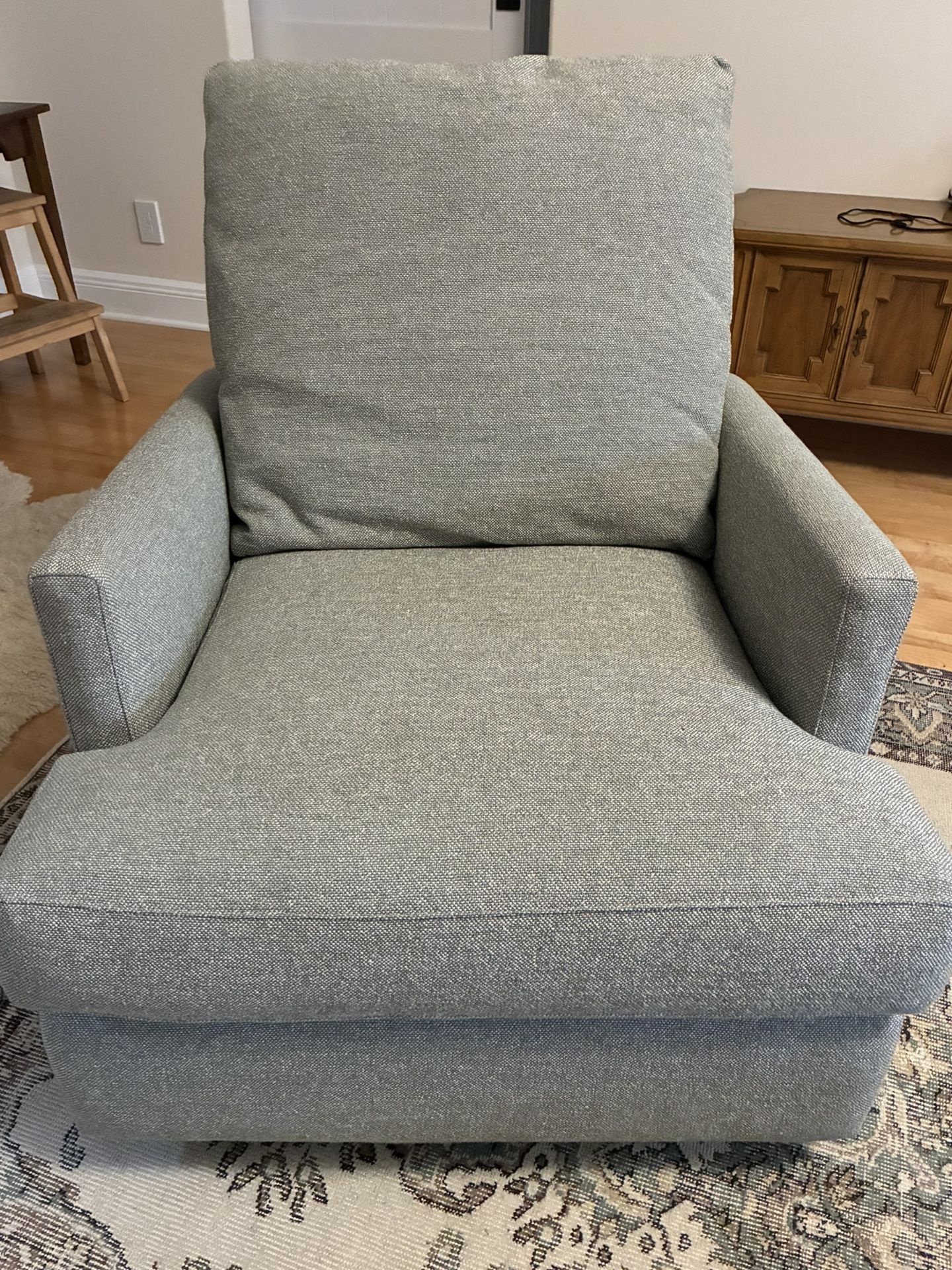 Beautiful comfy swivel glider, great brand new like condition. Lovely sage-grey like color with white blend. From non smoking, no pet home.