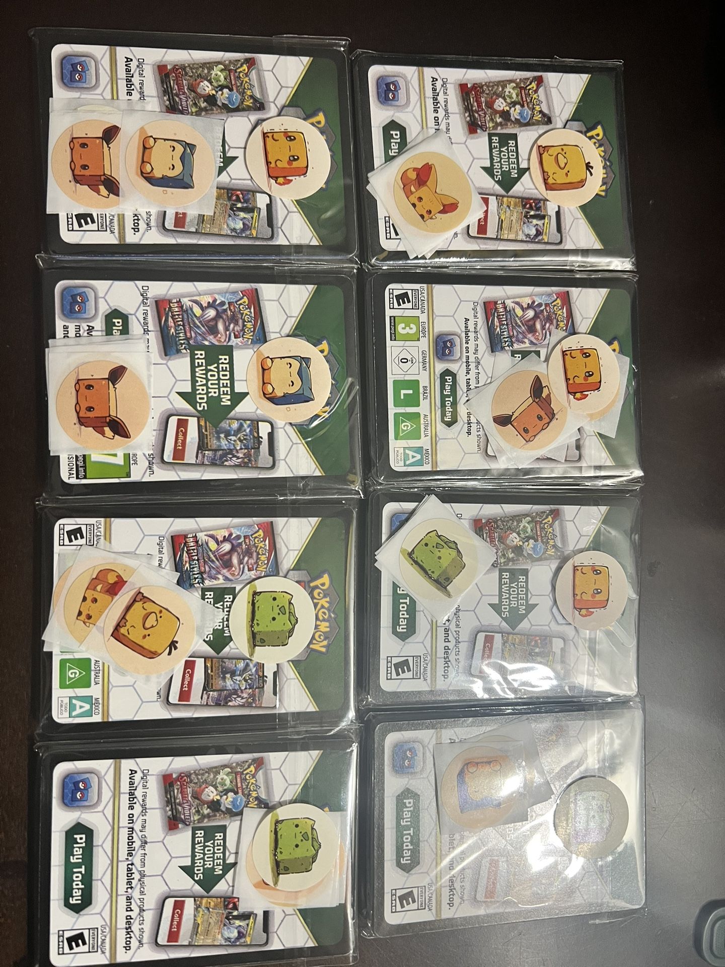 44 mystery packs with 10-20 cards and roughly a 70% hitrate. Each pack has 5-10 holos and reverse holos with a chance of an ex, V, VStar, VMax, Ir, Full art, SIR etc, 4 stickers and 1 or 2 code cards. Cards ranging from base set to 151 and more. Cash or Cashapp only $5 dollars each or take all 44 for $200 pickup or $220 meet.