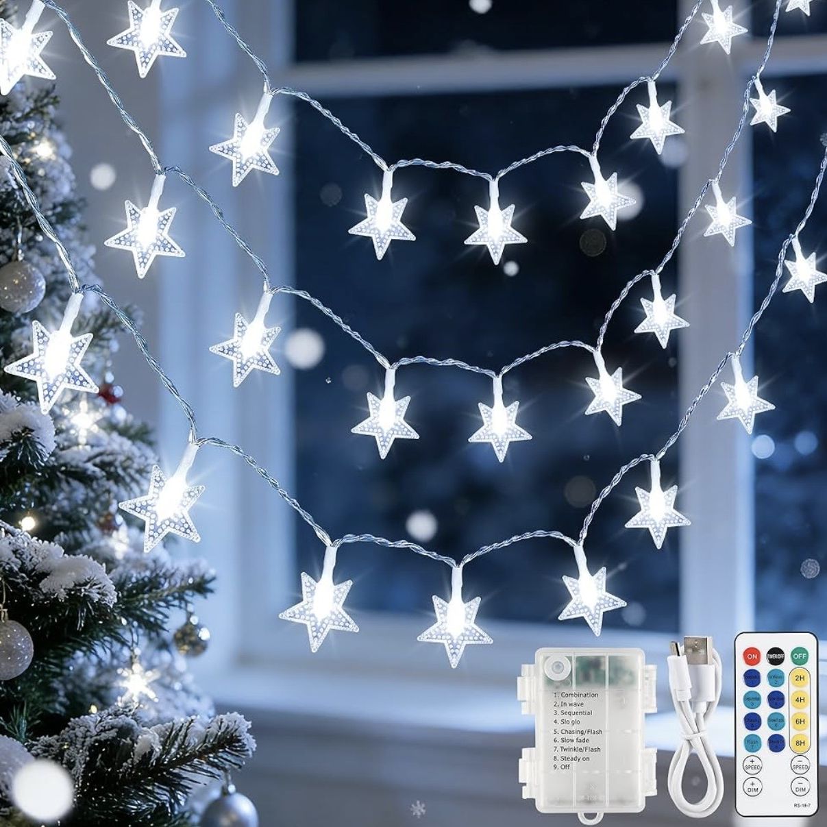 Star String Lights Battery/USB Powered,16.4FT 50LED Star Fairy Lights with Remote, Star Twinkle Lights with Timer for Indoor&Outdoor, Bedroom, Tent, Wedding, Christmas Tree Decor, White