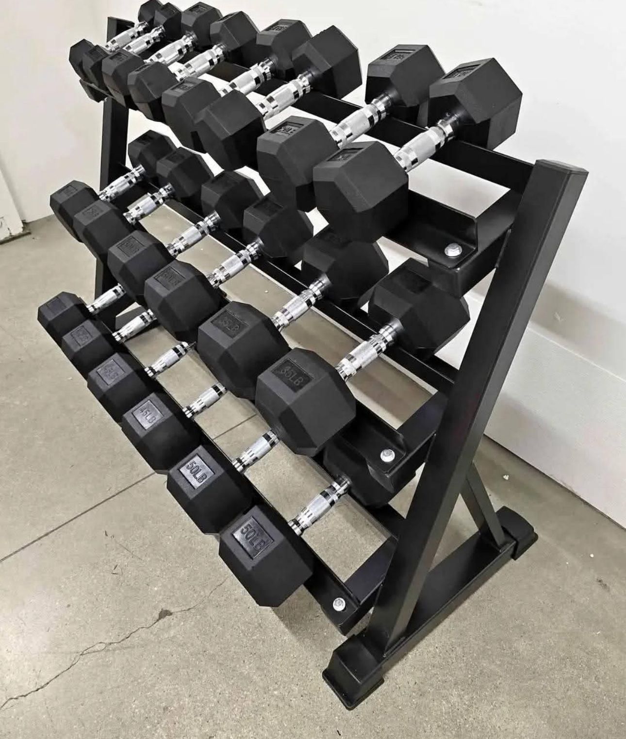 Everything is new in box 📦 multiple sets available. Display picture is what you see. Assembly required for the racks and you’ll have to unbox the dumbbells ‼️PRICING IS FOR DUMBBELLS ONLY‼️ 5, 10, 15, 20, 25, 30, 35, 40, 45, 50 lb rubber coated hex dumbbells (550 lbs) some have black handles, some have chrome handles, some will say “lb” ➕3-tier dumbbell rack (new in box) - $850 total 3 tier - 25.6"D x 51.57"W x 37.4"H 2 tier - 27"D x 64.5"W x 28.5"H Pick up in Plano 75023 Pricing is firm! No offers or trades ‼️ Venmo or zelle accepted but cash preferred Delivery ($50-100) paid upfront Ask about 55-75 lb options, 55-100 lb options, weight plates, adjustable dumbbells, 7’ barbells, squat racks, benches, Pelotons, yoga mats, rubber stall mats, and other workout equipment