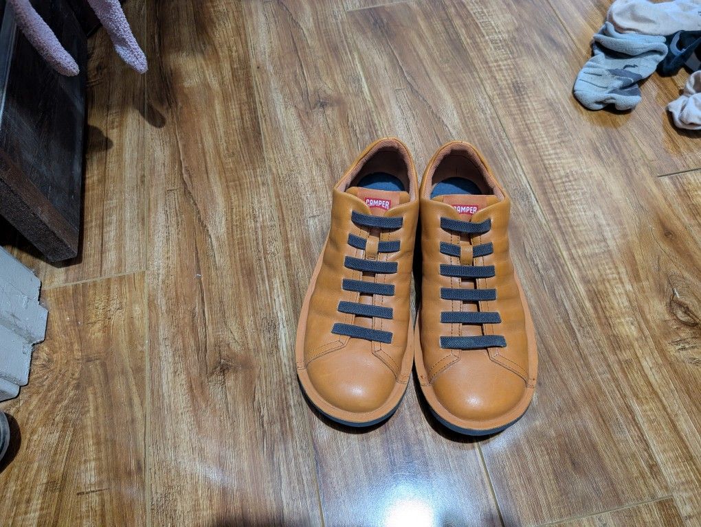 100% Leather: European Camper Shoes. European size 41. Worn once. Purchased these Campers, love the color but the length size is a bit too small and I never returned them. No wear or tear on them.