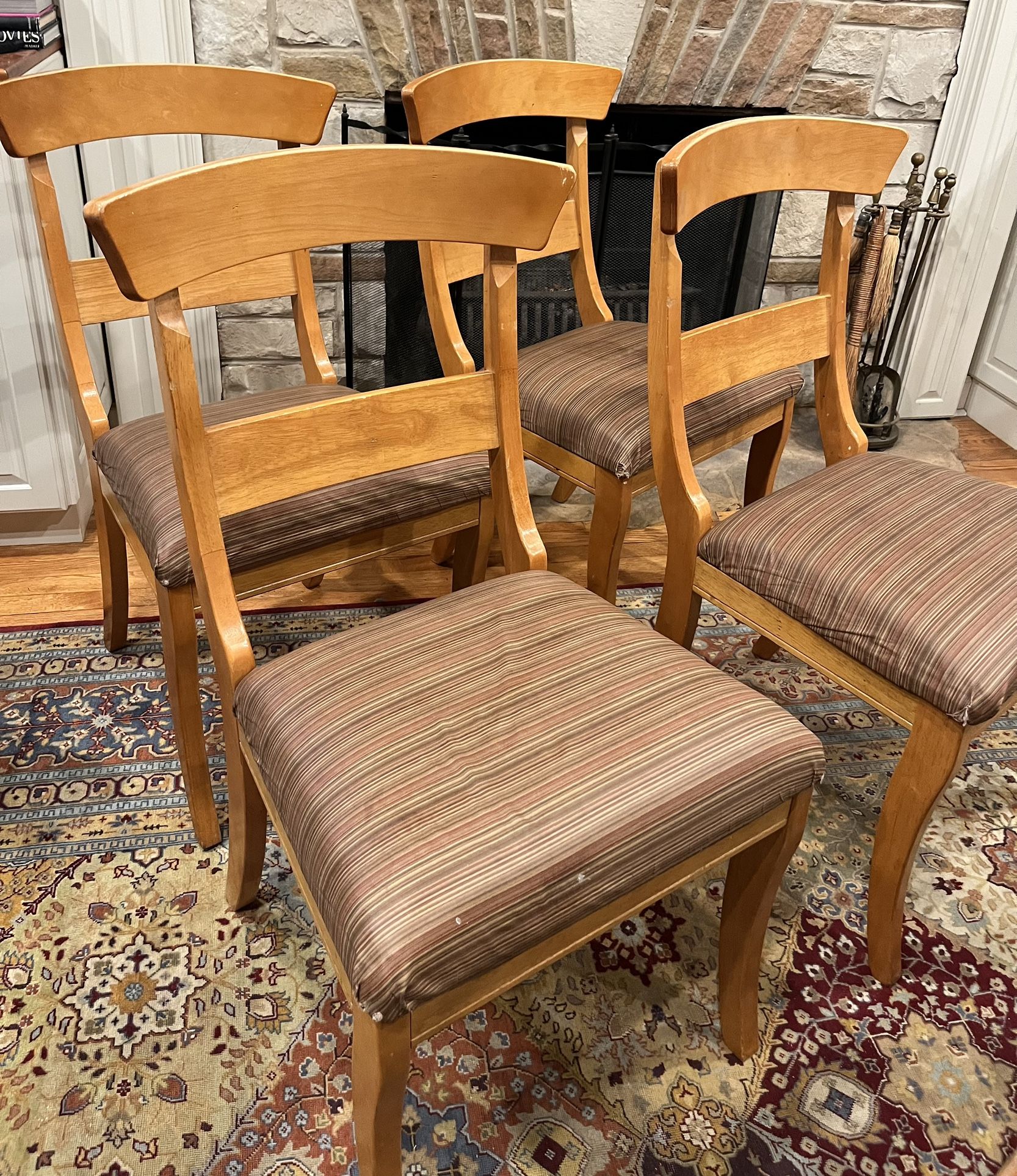 Selling this set of 4 solid wood dining room chairs. Could stand to be reupholstered. Chair pads unscrew easily. Each measures: 36" T from floor to top of back and 19" from floor to top of seat x 16" D x 20" W. From smoke-free home. Cash only.