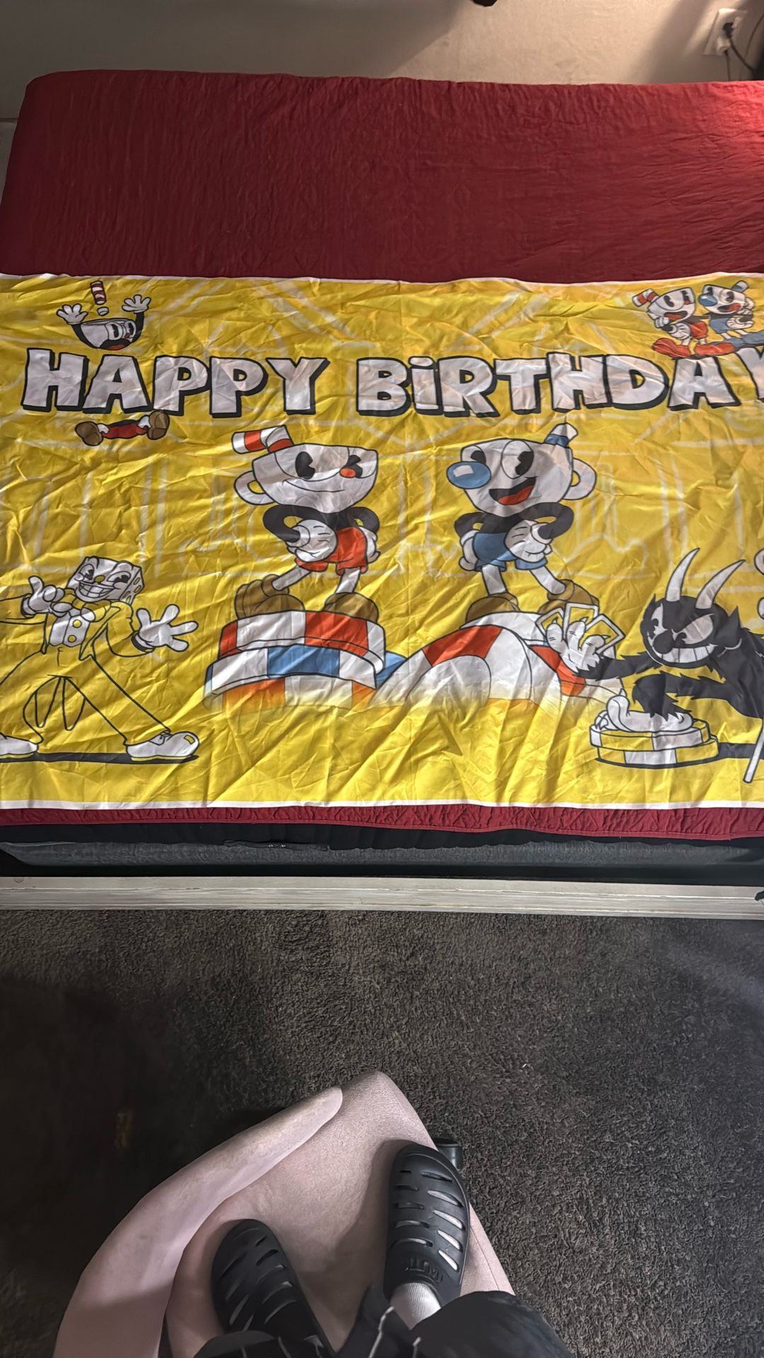 YOKIKY Cuphead Happy Birthday Photography Backdrop used for party decoration. My bed is a size full. It is a decent size banner excellent condition only used it once located in San Bernardino if interested.
