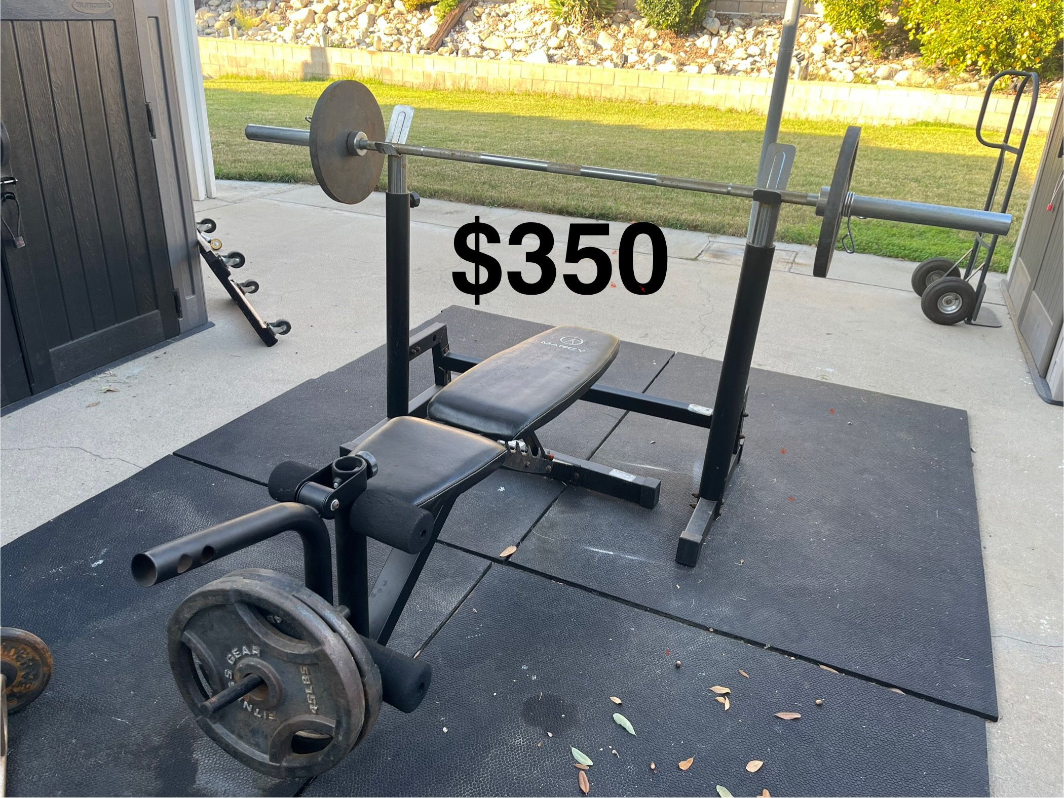 work out bench set Comes with Olympic barbell Declining an incline Marcy bench press and squat rack Weight rack / tree Set of 45 , 35 ,25 10 and 5 plates