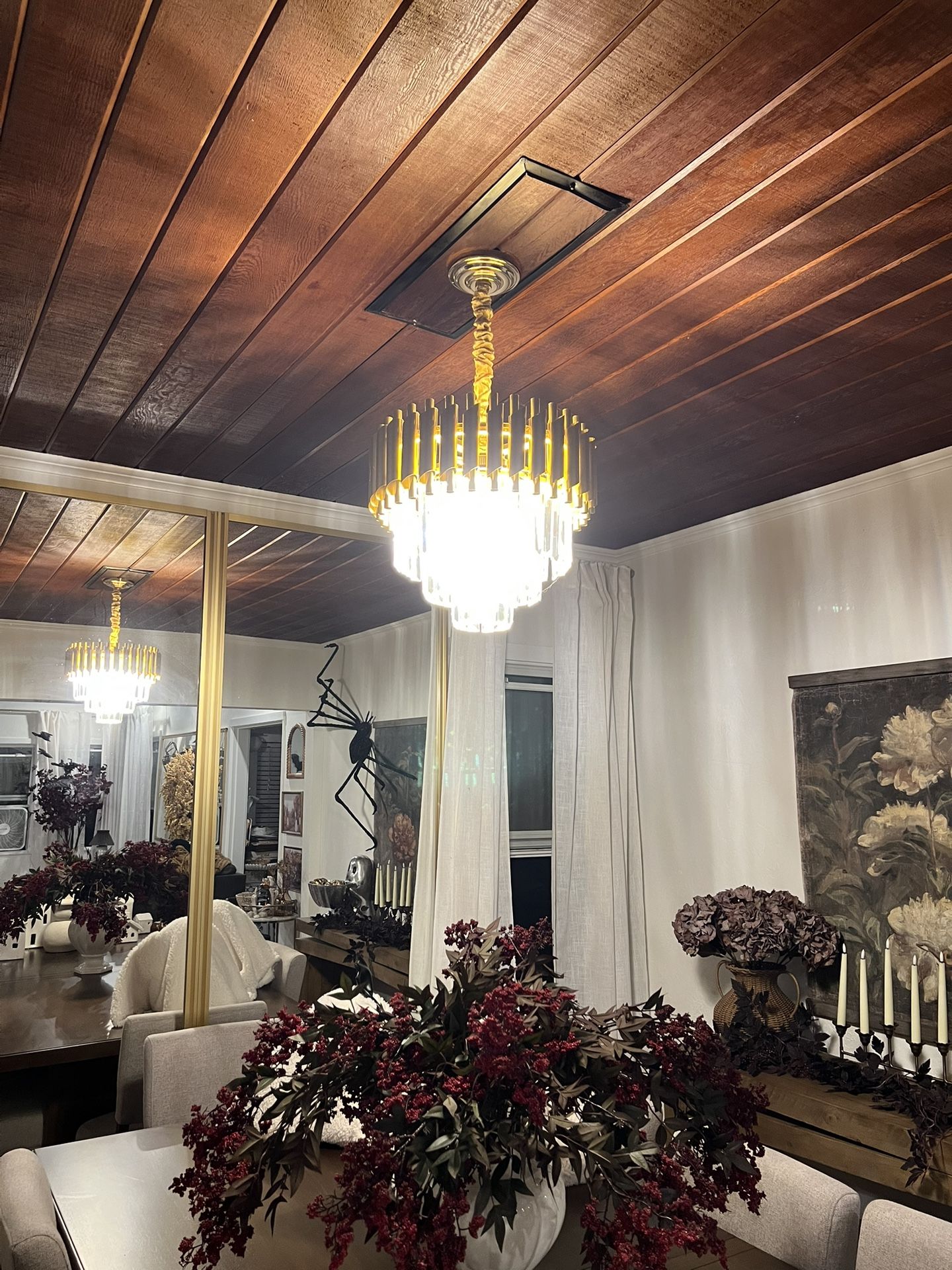 Gold Crystal Chandelier. I’m selling because I bought another one. It works and in great condition. Bought it a couple of months ago. $80 OBO Hablo Espanol
