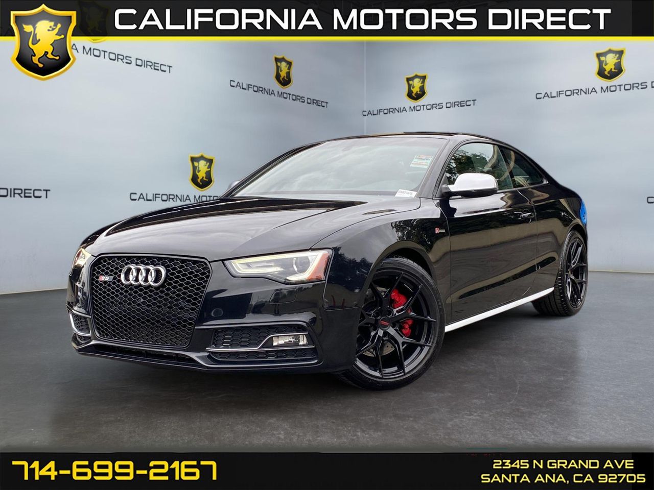 Audi MMI Navigation Plus Package (Audi Parking System Plus w/Rearview Camera, HDD Navigation w/Voice Control, and Radio: 1 CD/DVD-Player & HD), Audi Quattro w/Sports Differential (Audi Drive Select Controls and Rear Sports Differential), 10 Speakers, 3-Step Heated S Sport-Contoured Front Seats, 4-Wheel Disc Brakes, 8.5J x 18"" 5-Parallel-Spoke S-Design Wheels, 9.0J x 19"" 5 Segment-Spoke-Design Wheels, ABS brakes, Air Conditioning, Alloy wheels, AM/FM radio: SiriusXM, Audi Adaptive Damping Suspension, Audi Advanced Key, Audi Guard All-Weather Floor Mats & Trunk Liner, Auto-dimming door mirrors, Auto-dimming Rear-View mirror, Automatic temperature control, Bang & Olufsen Sound System, Brake assist, Bumpers: body-color, Carbon Sigma Atlas Inlays, CD player, Compass, Delay-off headlights, Driver door bin, Driver vanity mirror, Dual front impact airbags, Dual front side impact airbags, Electronic Stability Control, Four wheel independent suspension, Front anti-roll bar, Front Bucket Seats, Front Center Armrest, Front dual zone A/C, Front fog lights, Front reading lights, Garage door transmitter: HomeLink, Headlight cleaning, Heated door mirrors, Heated front seats, High-Intensity Discharge Headlights, Illuminated entry, Knee airbag, Leather Shift Knob, Leather steering wheel, Leather/Alcantara Seat Trim, Low tire pressure warning, Memory seat, Occupant sensing airbag, Outside temperature display, Overhead airbag, Overhead console, Panic alarm, Passenger door bin, Passenger vanity mirror, Power door mirrors, Power driver seat, Power moonroof, Power passenger seat, Power steering, Power windows, Radio data system, Radio: Audi Concert System w/1CD Player, Rain sensing wipers, Rear air conditioning, Rear anti-roll bar, Rear fog lights, Rear reading lights, Rear seat center armrest, Rear window defroster, Remote keyless entry, Security system, Speed control, Speed-sensing steering, Speed-Sensitive Wipers, Split folding rear seat, Sport steering wheel, Steering wheel mounted audio controls, Stone Guards w/o Super Charged Badges Alu-Optic, Super Charged Badges, Tachometer, Telescoping steering wheel, Tilt steering wheel, Traction control, Trip computer, Turn signal indicator mirrors, Variably intermittent wipers, and Without Front License Plate Holder.Reviews: * The 2013 Audi A5 series provides the kind of grace and beauty seemingly lost on so many cars today, yet doesn’t sacrifice comfort or confidence in the process. Fuel economy and power go hand-in-hand with the A5, and most models can be equipped with a manual transmission. Source: KBB.com * Attractive styling; balanced ride and handling; premium interior; all-wheel-drive traction. Source: EdmundsWith over 100 vehicles in stock we are California's low price leader. Don’t be surprised by the prices, all cars are CLEAN TITLE VEHICLES. In some cases the manufacturer warranty still applies, if not aftermarket warranties & service contracts are available at great prices. We have all types of financing based on your credit. We guarantee your experience will be pleasant, our sales staff is on salary to eliminate haggling and to make the customers buying experience a great one! Used Cars Santa Ana, Used Cars Southern California, Used Cars Orange County. 2013 Audi S5 3.0T Premium Plus quattro