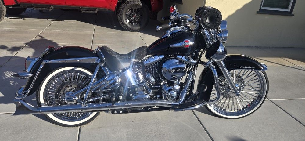 Harley Davidson Heritage Softail 2017 6speed 103 High Output Very low miles 11k Garage Kept Allways service and waxed good white wall tires runs like new Salvage title tags up to date title under my name sound system Ds18 speakers double din 7in screen with apple car play Navigation verry loud 33 in dual fishtail sissybar and rack included .