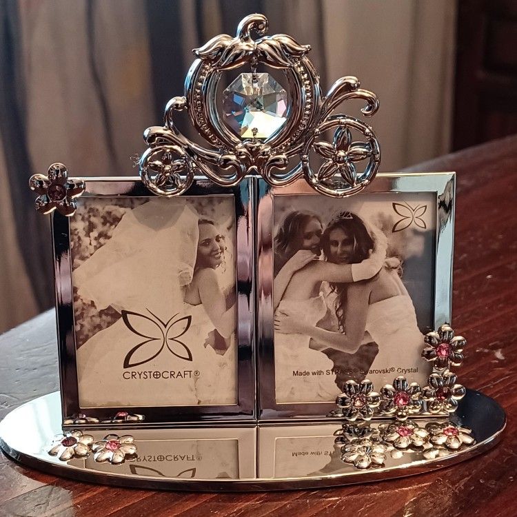 This is a beautiful Cinderella Wedding Carriage polished metal, Crystocraft made with STRASS SWAROVSKI Crystals, double picture frame . Often used as a wedding gift or commemorative keepsake. Embellished with crystals from SWAROVSKI.