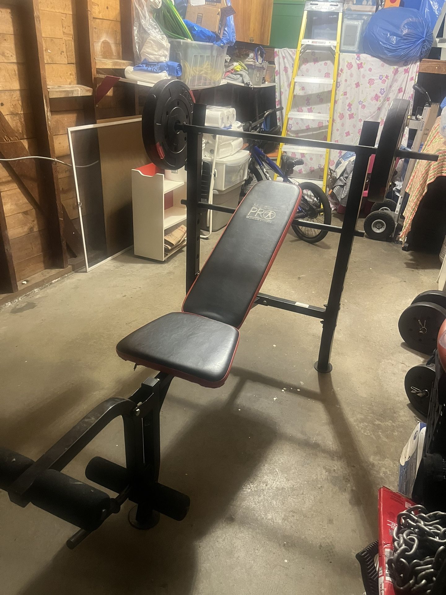 Comes with everything from the original set + additional weights I bought individually Everything Pictured. Adjustable Bench press and weights have no flaws. The 25lb weights have red duct tape on it as it had to be put on after the weights got scraped / chipped. Other weights are a bit scraped / chipped, but still work perfectly fine, it’s just a cosmetic thing Weights from the Original Set: (100lb total) -Two 10lb Weights (20lb Total) -Two 15lb Weights (30lb Total) -Two 25lb Weights (50lb Total) Additional Weights I’m including in this Listing that did not originally come with the Marcy Pro Bench Press Set -Two 45lb Weights (90lb Total) -Four 2.5Lb Weights (10lb Total) -Four 7.5lb Weights (30lb Total) -One 10Lb Weider Dumbell -One 8lb Weider Dumbell Great Value. Not delivering. Please be responsible for transporting the equipment and picking up. Let me know if there’s any questions, thank you